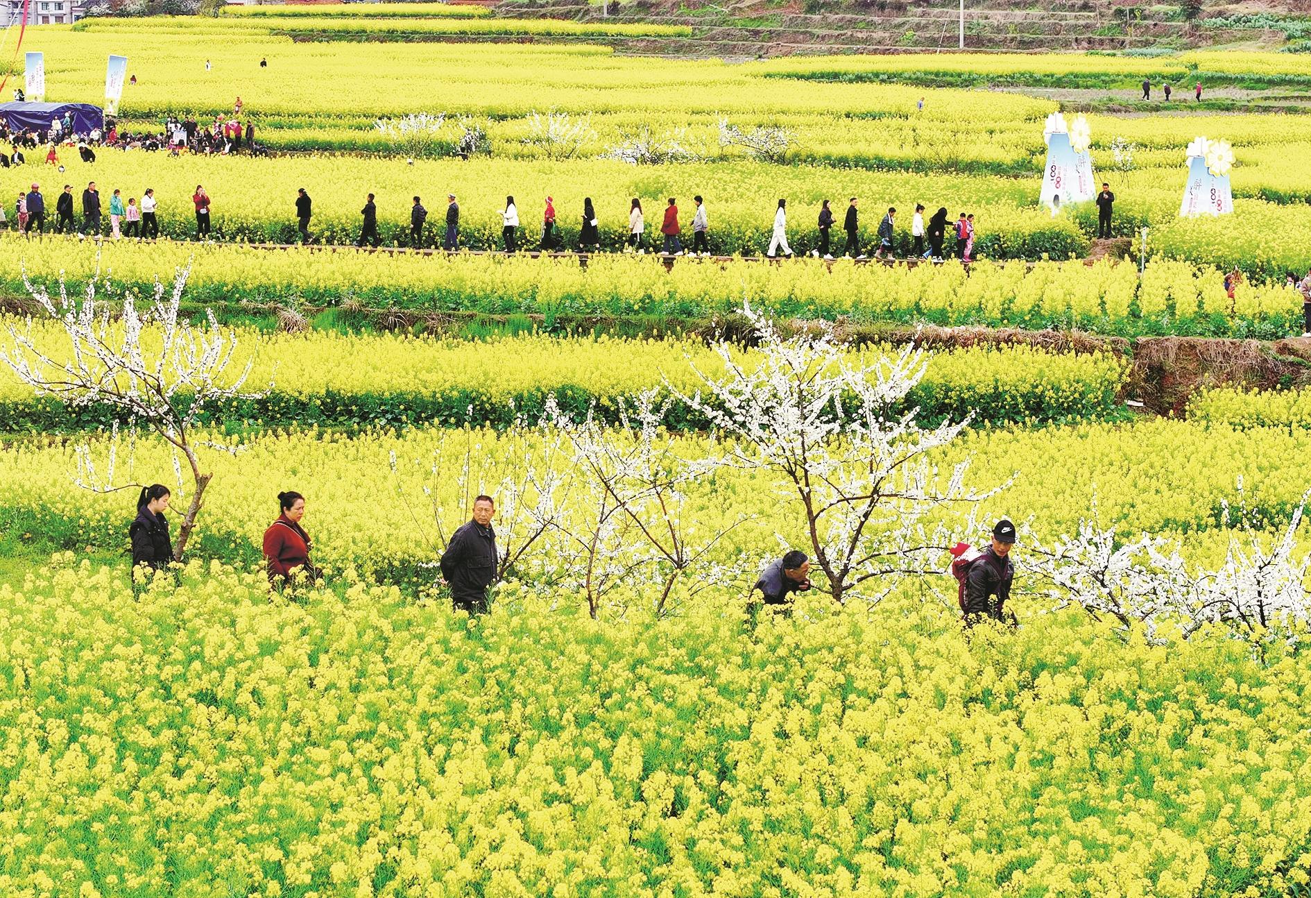 3月17日,人们在贵州省黔东南苗族侗族自治州黄平县旧州镇白纸桥村赏花游玩。近日,随着气温升高,人们纷纷来到户外踏青游玩,乐享春日时光。