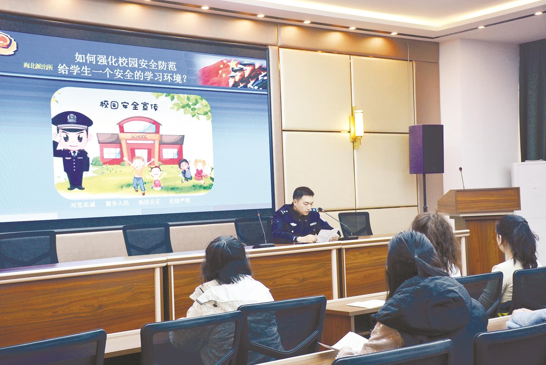 近日,海勃湾公安分局海北派出所民警走进海勃湾区第二幼儿园,举办校园安全讲座。民警结合典型案例,向老师们讲解校园安全知识、反诈知识等,筑牢校园安全屏障。 (曹艺 摄)