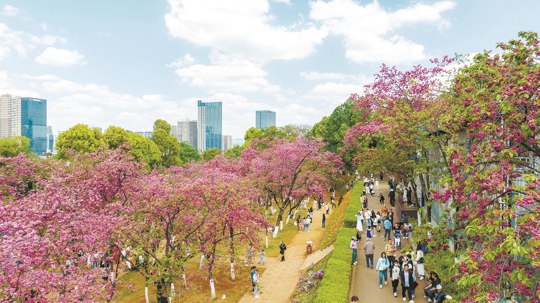 3月24日,游客在昆明圆通山公园观赏樱花。近日,云南昆明圆通山公园的樱花进入盛花期,吸引众多市民和游客前来观花赏景,乐享春日时光。