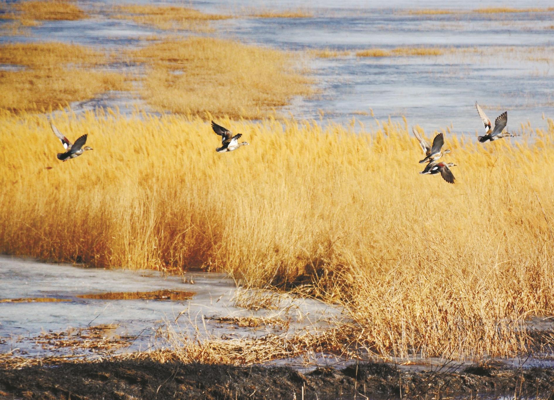 秋沙鸭在龙游湾国家湿地公园内轻舞飞翔。