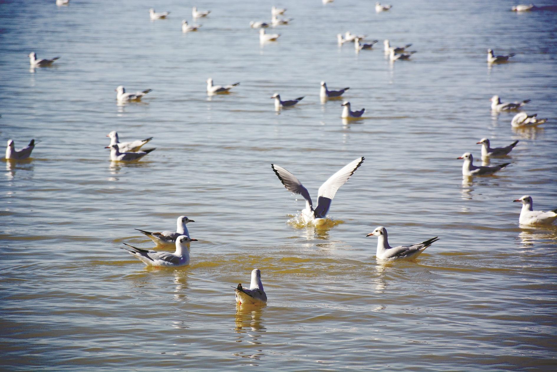 红嘴鸥在乌海湖畔嬉戏觅食。
