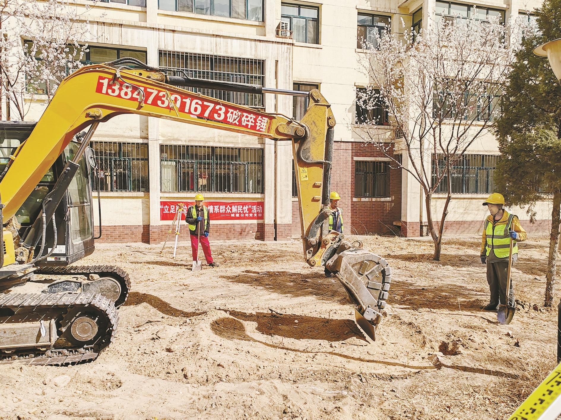 3月26日,海勃湾区新华西街道盛世社区党委联合市城建投融资有限责任公司党支部开展“立足岗位作贡献 情系群众解民忧”活动,为盛世华庭南区硬化路面近300平方米,为小区后续建设提供帮助。图为工人在小区做路面硬化准备工作。 (张楚研 摄)