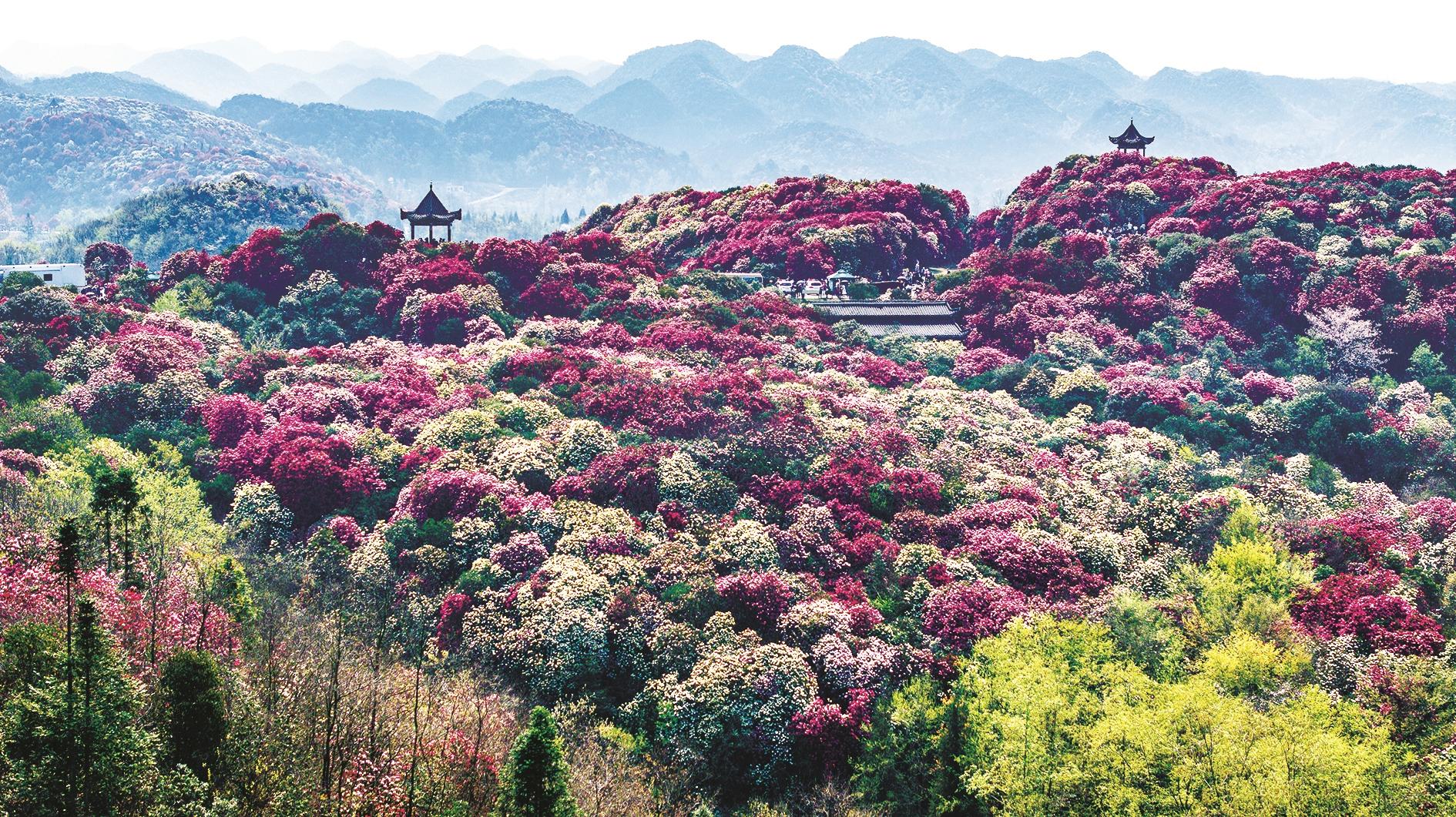 3月30日,毕节市百里杜鹃普底景区的杜鹃花带风景。仲春时节,大地复苏。贵州省毕节市百里杜鹃景区的杜鹃花进入盛花期,前来赏花游玩的游客络绎不绝。百里杜鹃风景名胜区原生杜鹃林带绵延50余公里,享有“地球彩带”的美誉。
