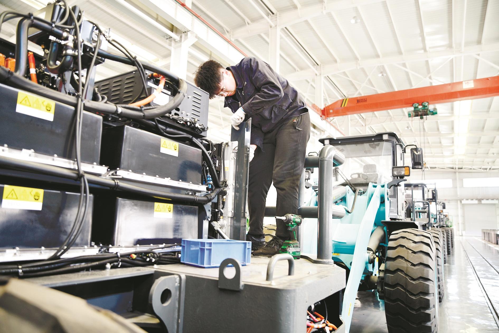 我市把新能源产业作为重要的发展支点,加大工业企业新能源和清洁能源运输装备推广应用,引导重点工矿企业使用新能源重卡。图为3月31日,在乌海海易通新能源汽车有限公司组装车间,工人正抓紧赶制汽车生产订单。 (王超 摄)