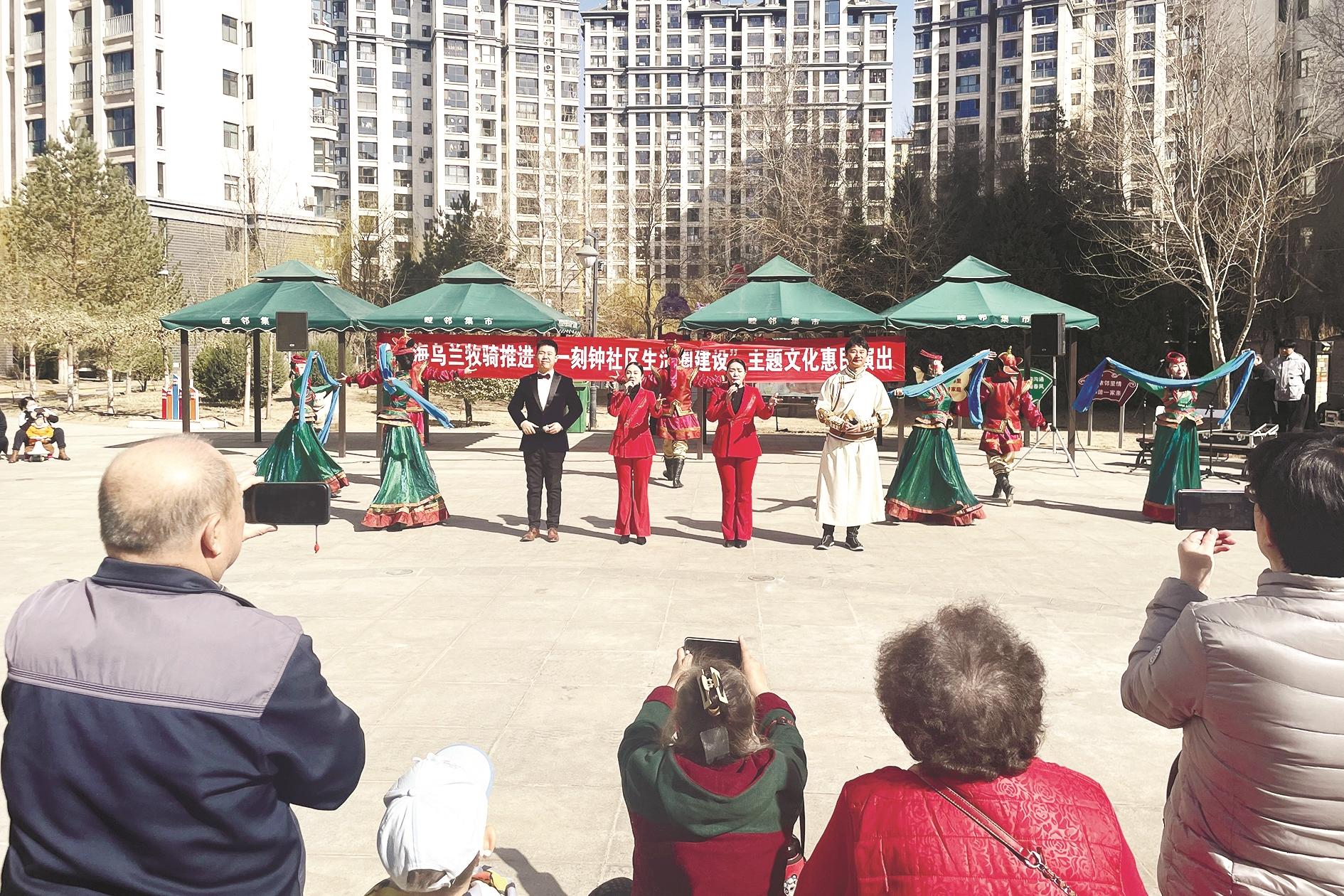 近日,乌海乌兰牧骑走进海勃湾区滨河街道湖东社区开展了“一刻钟社区生活圈建设”主题文化惠民演出活动。活动中,乌海乌兰牧骑队员表演了舞蹈、歌曲、乐器演奏等节目,让辖区居民群众体验了一次“沉浸式”的北疆文化熏陶。
