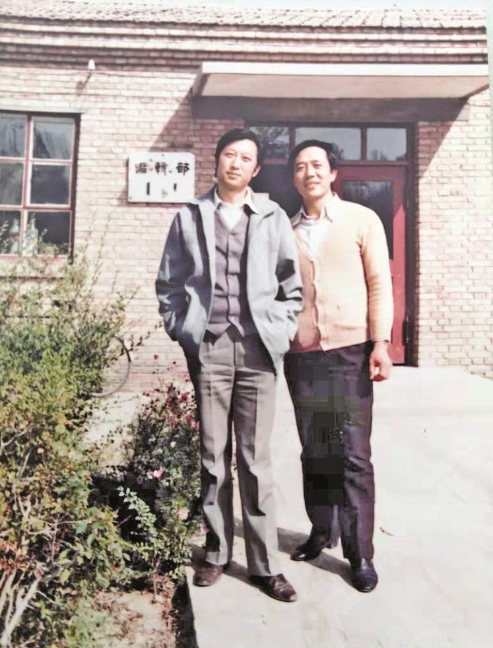 1986年,记者吕联义、胡长连在乌海日报社的平房办公室门前合影。(吕联义提供)