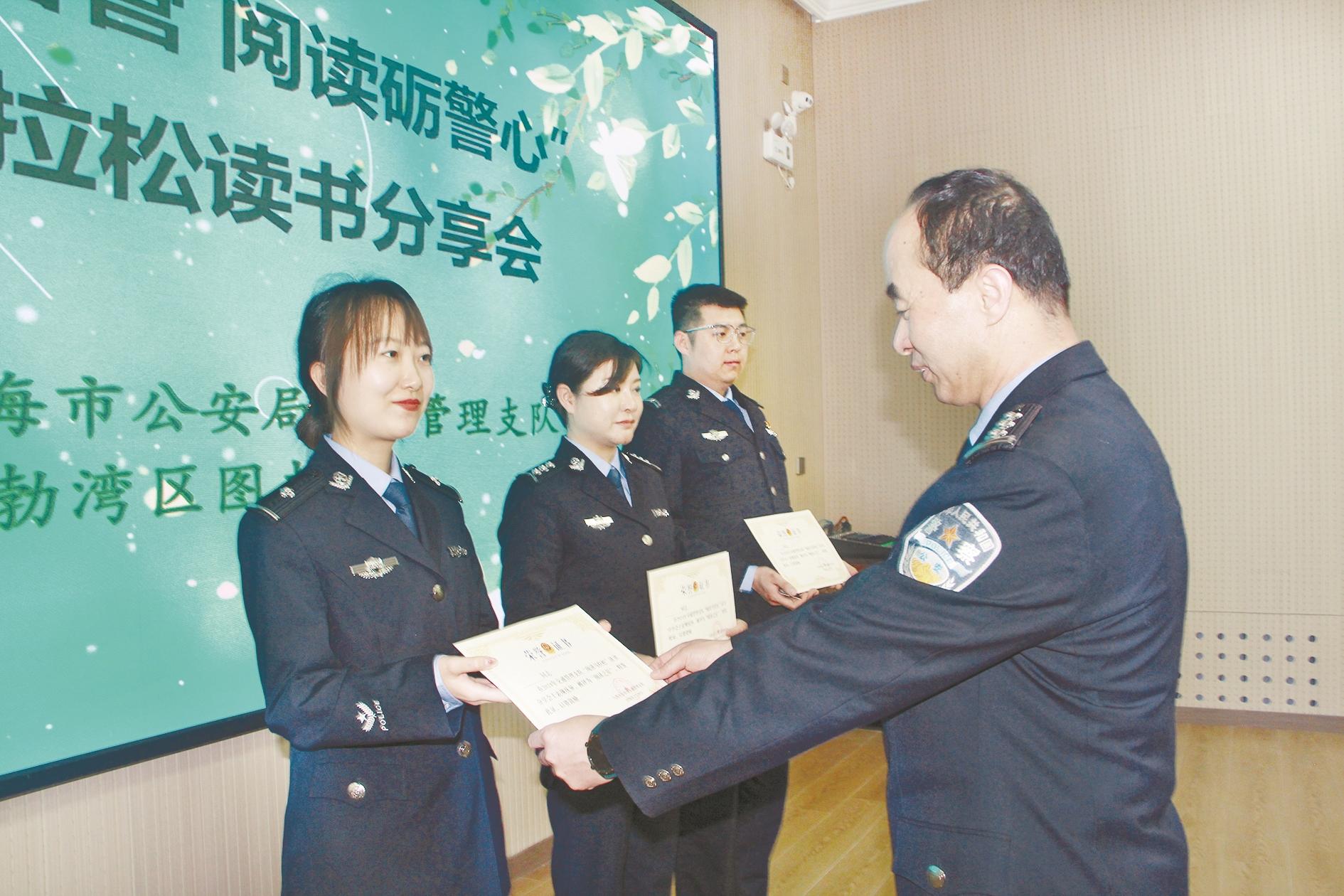 3月29日,市公安局交通管理支队联合海勃湾区图书馆共同开展“阅读马拉松”读书分享活动。活动现场,8名民警分享了自己喜爱的书籍,最后评选出3名“阅读之星”并发放荣誉证书。 (段维娜 摄)