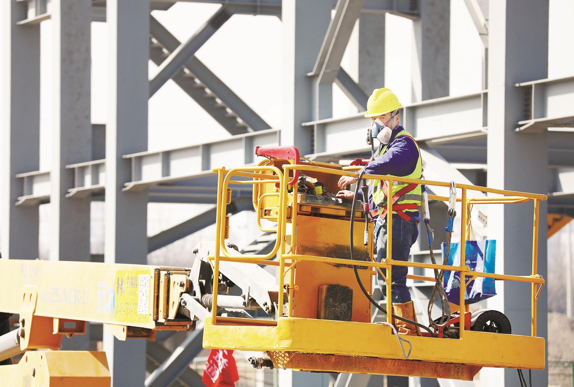 乌达产业园内,工人在安装钢架。(赵政宇 摄)