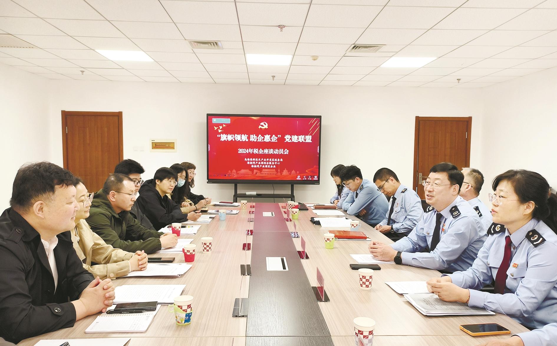 4月2日,乌海高新技术产业开发区税务局党总支启动党建联盟工作机制,邀请企业党员代表在海勃湾产业园综合服务中心开展税企座谈,宣传税费优惠政策。