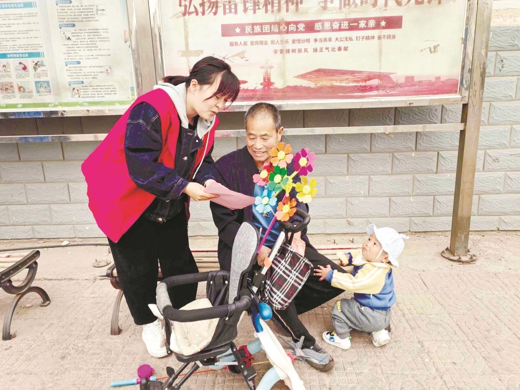 团结北路社区工作人员倡导居民文明过节。(张丽阳 摄)