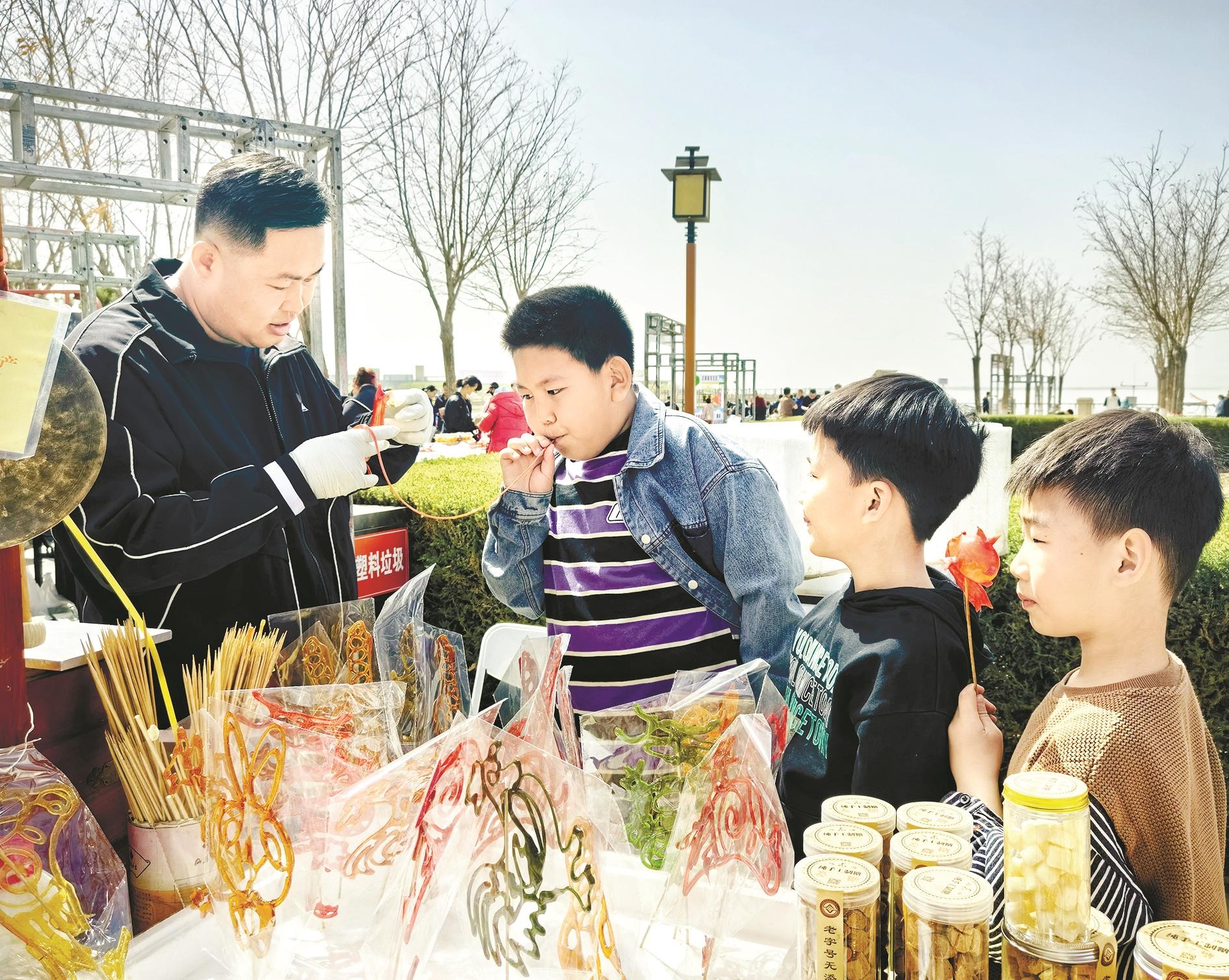 4月4日,市文体旅游广电局联合市农牧局、乌海全域文化旅游产业发展集团有限责任公司举办赏春踏青游一起“趣”观鸟——乌海观鸟季系列活动。本次活动分为观鸟区域、非遗展示区域、农副产品售卖区域、体育区域、演出区域以及社教活动区域。图为市级非遗文化“吹糖人”项目传承人张文化在非遗特色集市内展示该项目的制作技艺,让游客近距离感受非遗项目的艺术魅力。 (张靖爽 摄)