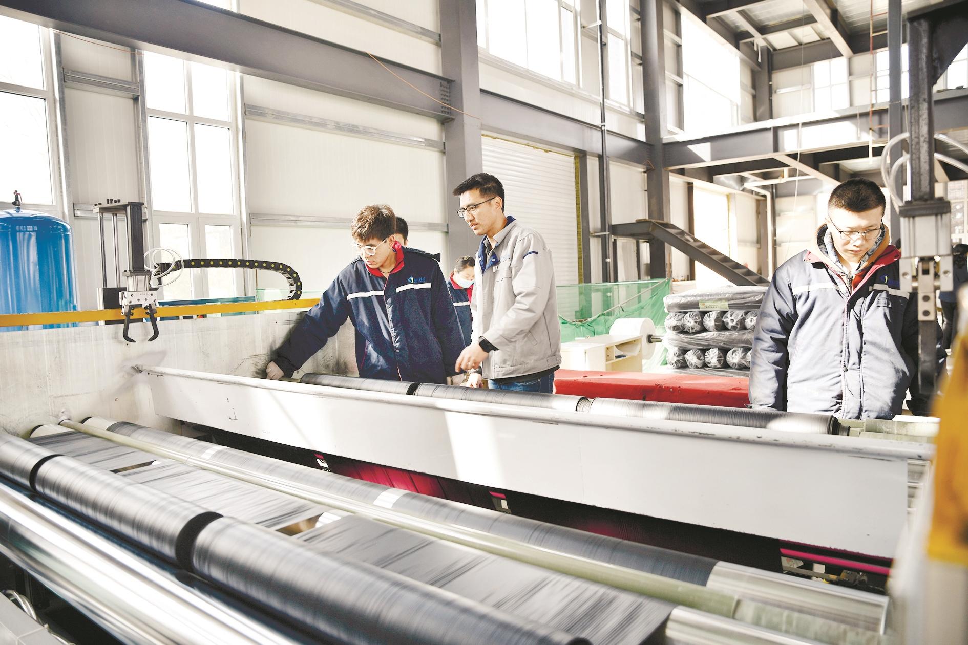 走进内蒙古金科发新材料科技有限公司地膜生产车间,制膜机正开足马力运行,各种型号的农用地膜源源不断地走下全自动生产线。?工作人员严把生产环节技术关,确保产品质量。(王超 摄)