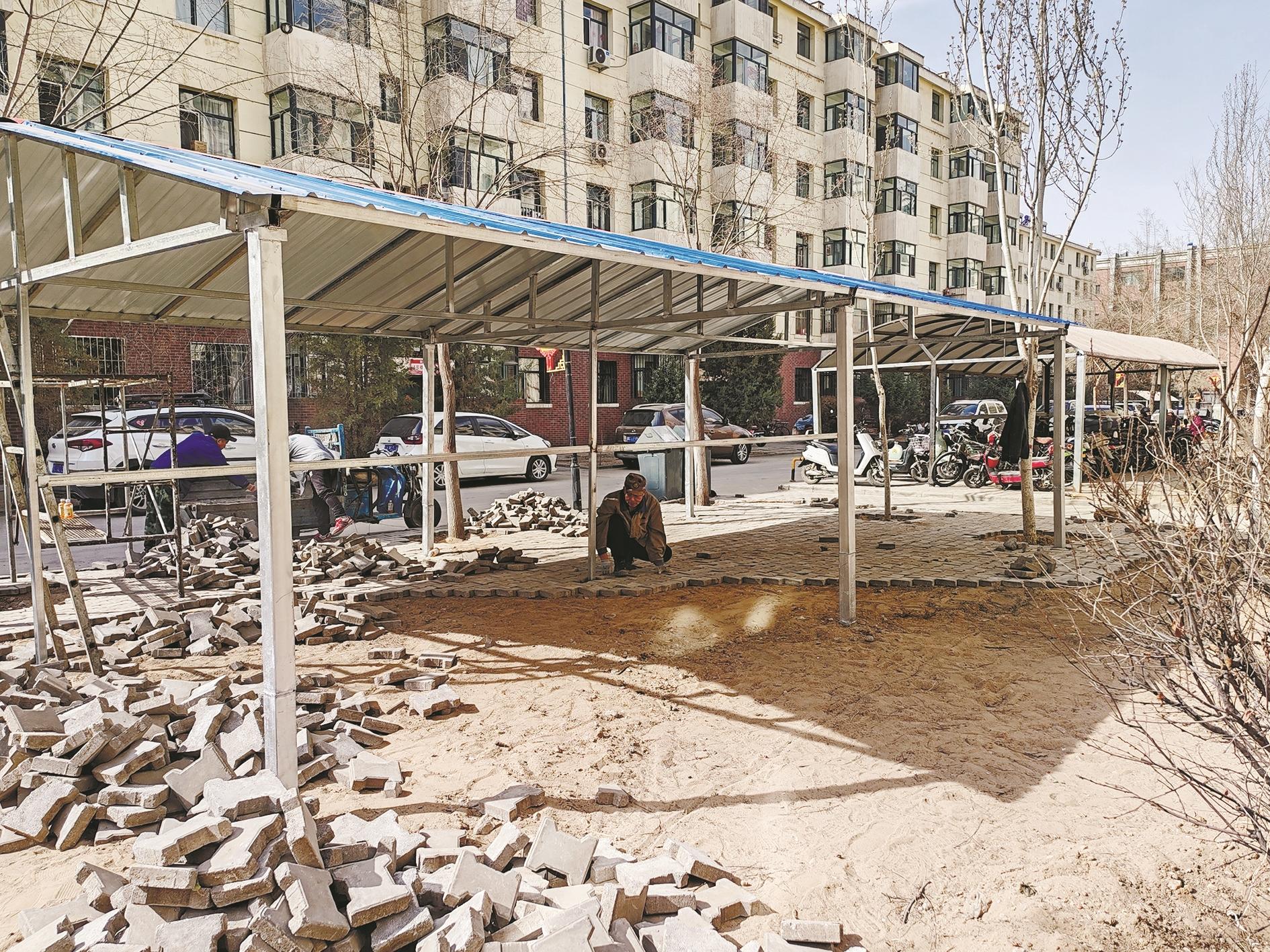 图②:近日,海勃湾区新华西街道盛世社区盛世华庭南小区增设自行车车棚,进一步满足居民自行车、电动自行车的停放、充电需求。 (张楚研 摄)