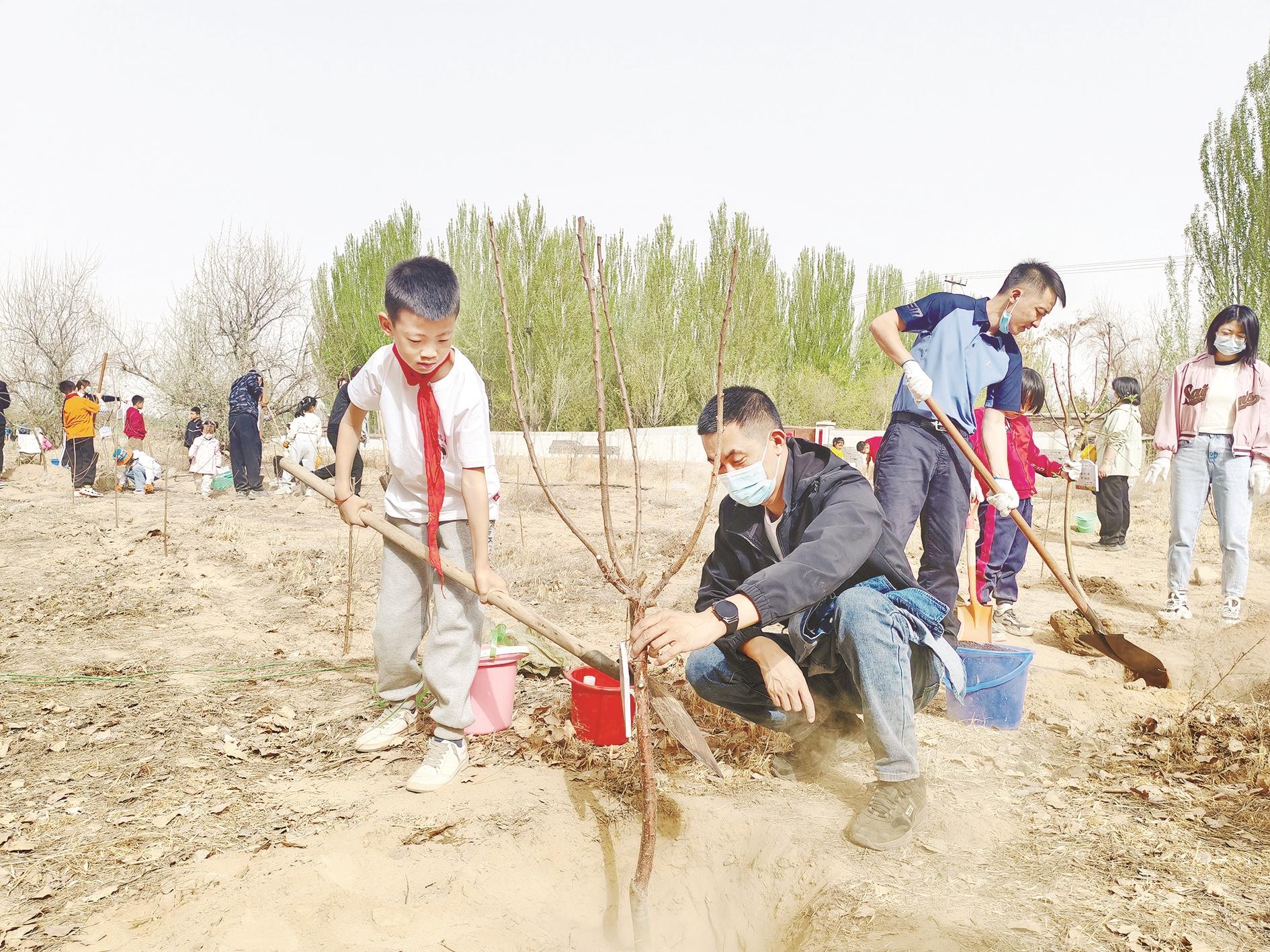 春回大地万物苏,植树添绿正当时。4月14日,市科学技术馆开展“传统文化培根润心”主题活动,广大青少年和家长一起植树,大家刨坑、种树、埋土、浇水,互相配合,美化环境。