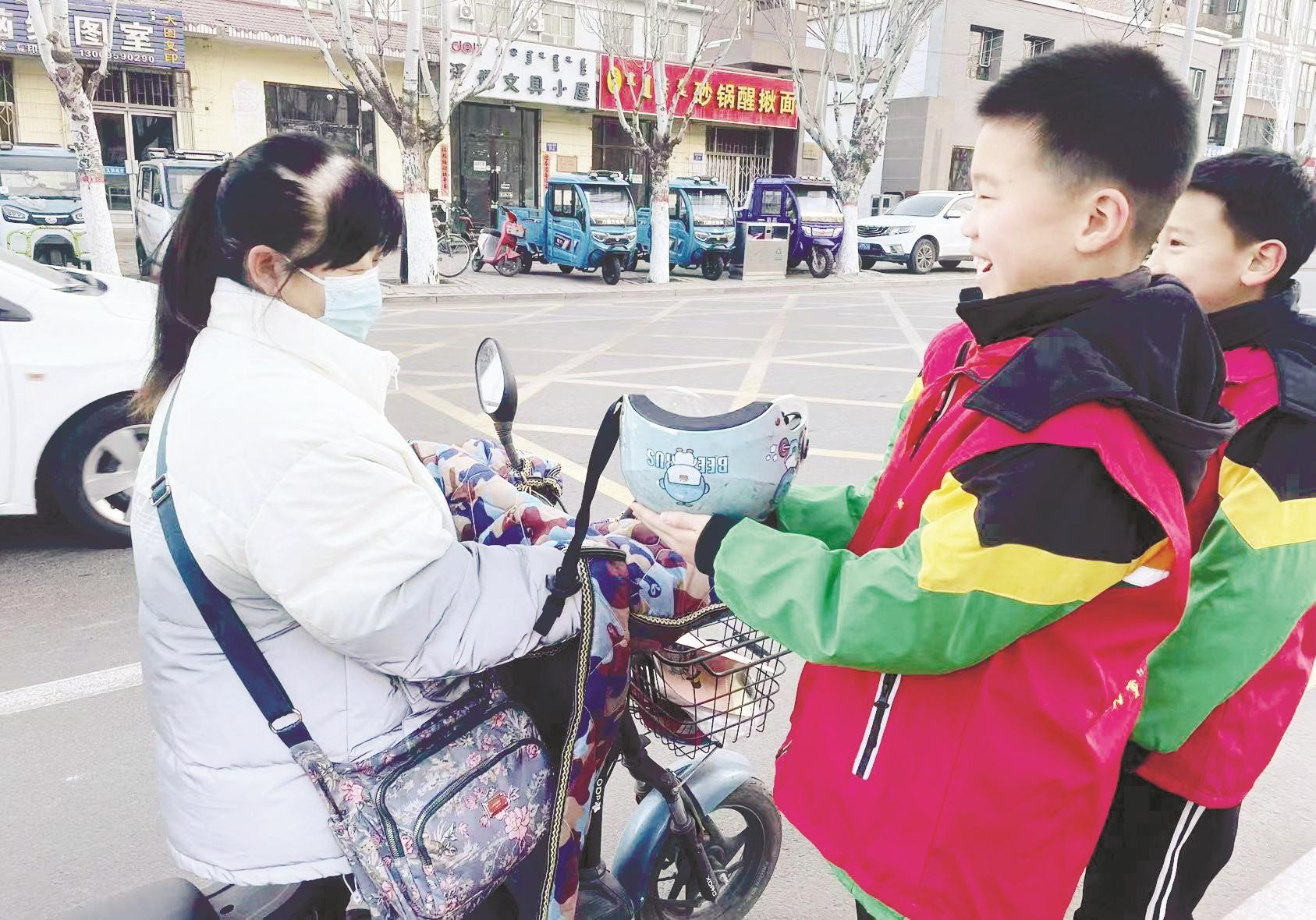 近日,海勃湾区第二小学的学生身穿红马甲化身志愿者,为家长和市民宣传交通安全知识,提醒大家骑电动车佩戴头盔,严格遵守交通法规。 (陈洋 摄)