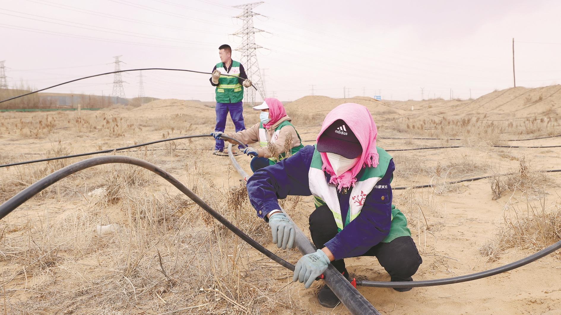 乌海市库布其—毛乌素沙漠沙化地综合治理项目现场,工人正在铺设水管。