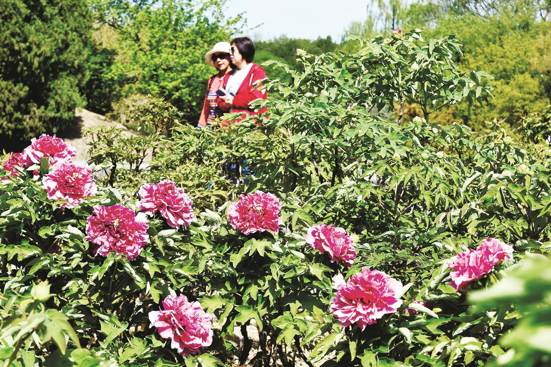 4月16日,游客在圆明园内欣赏盛开的牡丹。最近,北京圆明园内的牡丹开始进入盛放期,吸引不少游人参观赏花。