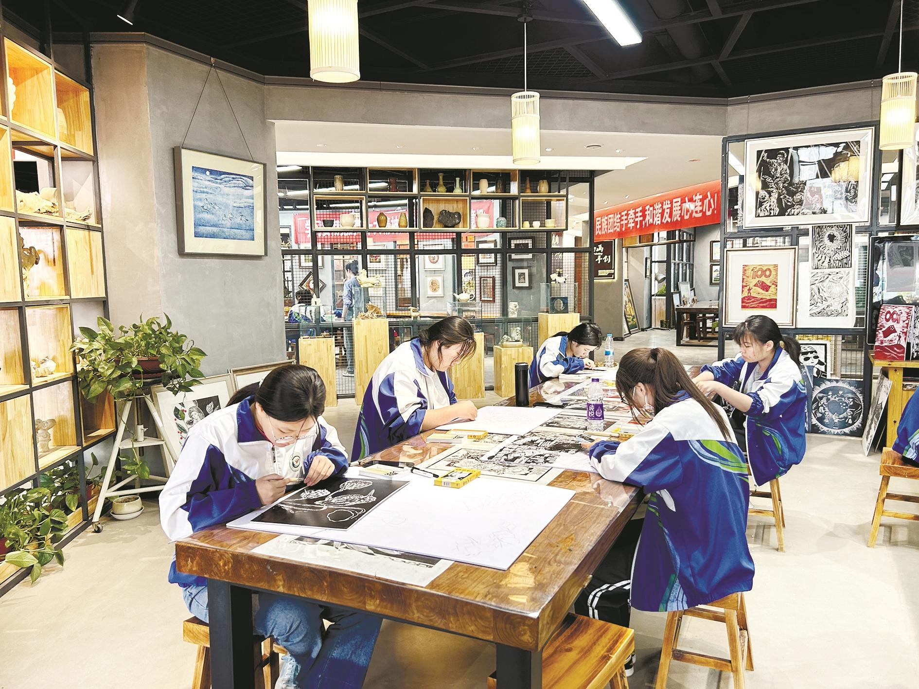 近年来,乌海市职业技术学校将陶艺、皮雕画、版画、书法、扎染、手工制作、摄影等工作室整合到一个空间内,建成了集教学、研发、制作、展示、体验、销售为一体的文化创意工坊,形成以教学教研—学生作品—手工产品—个性商品为链条的“产学研”模式。图为学生在工坊内制作版画。