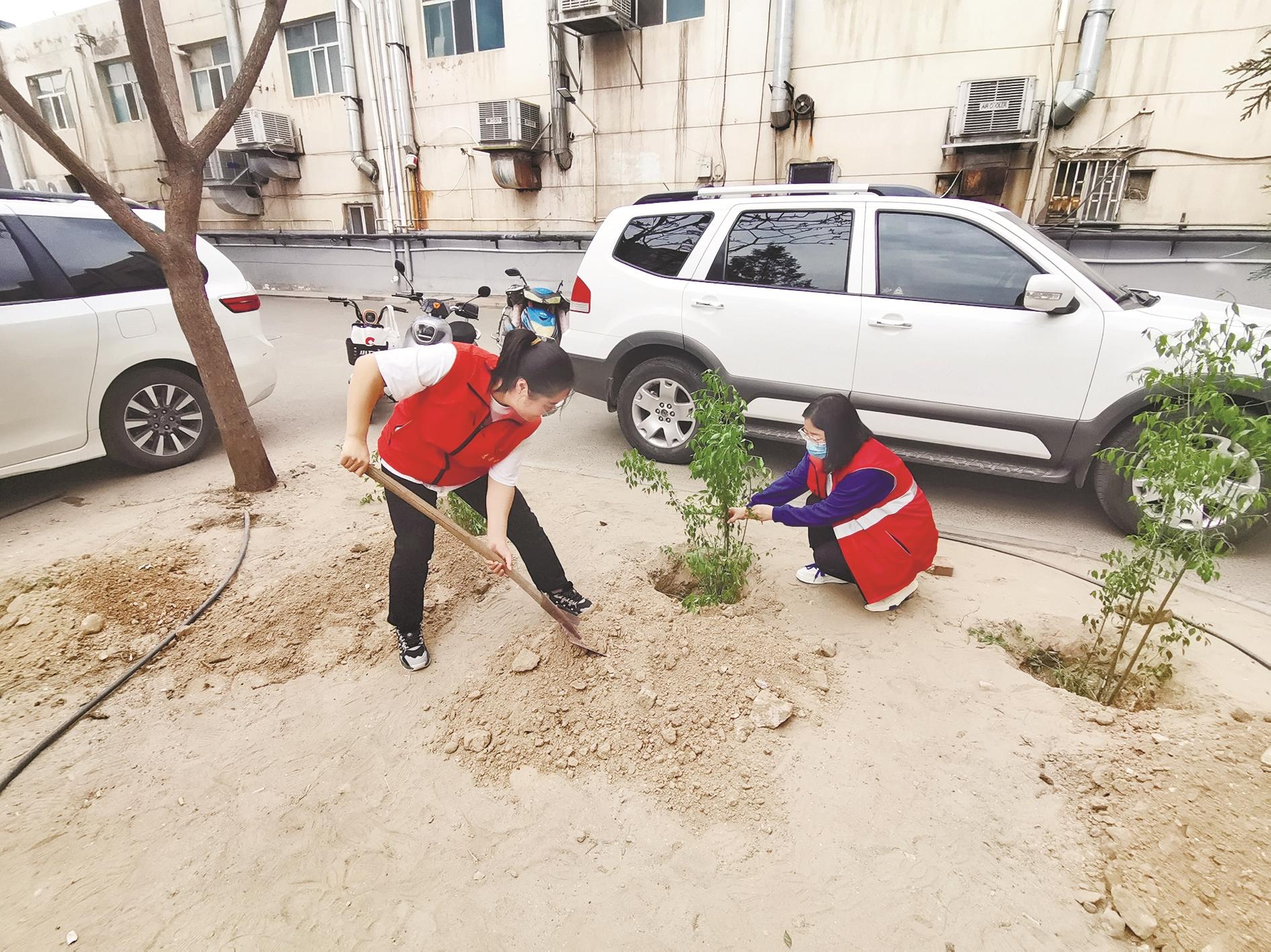 近日,海北街道青山社区开展“我为小区植树,共建绿色家园”活动。图为工作人员在凯豫苑小区植树。 (毕晓敏 摄)