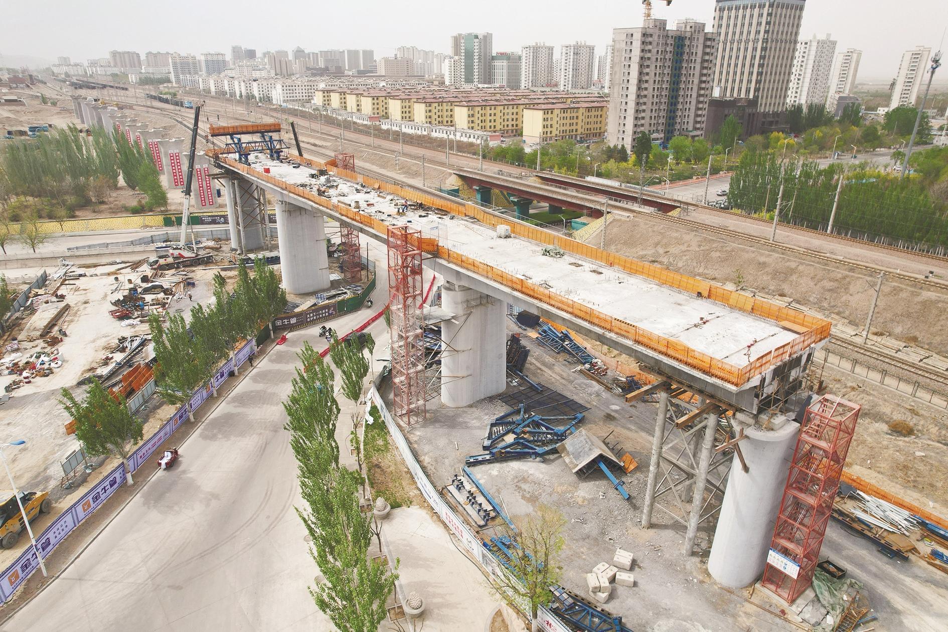 近日,在海勃湾区黄河西街与乌珠慕路交叉口附近的包银高铁项目乌海特大桥工程施工现场,跨乌珠慕路连续梁中跨合龙段完成浇筑,标志着跨乌珠慕路连续梁顺利合龙。