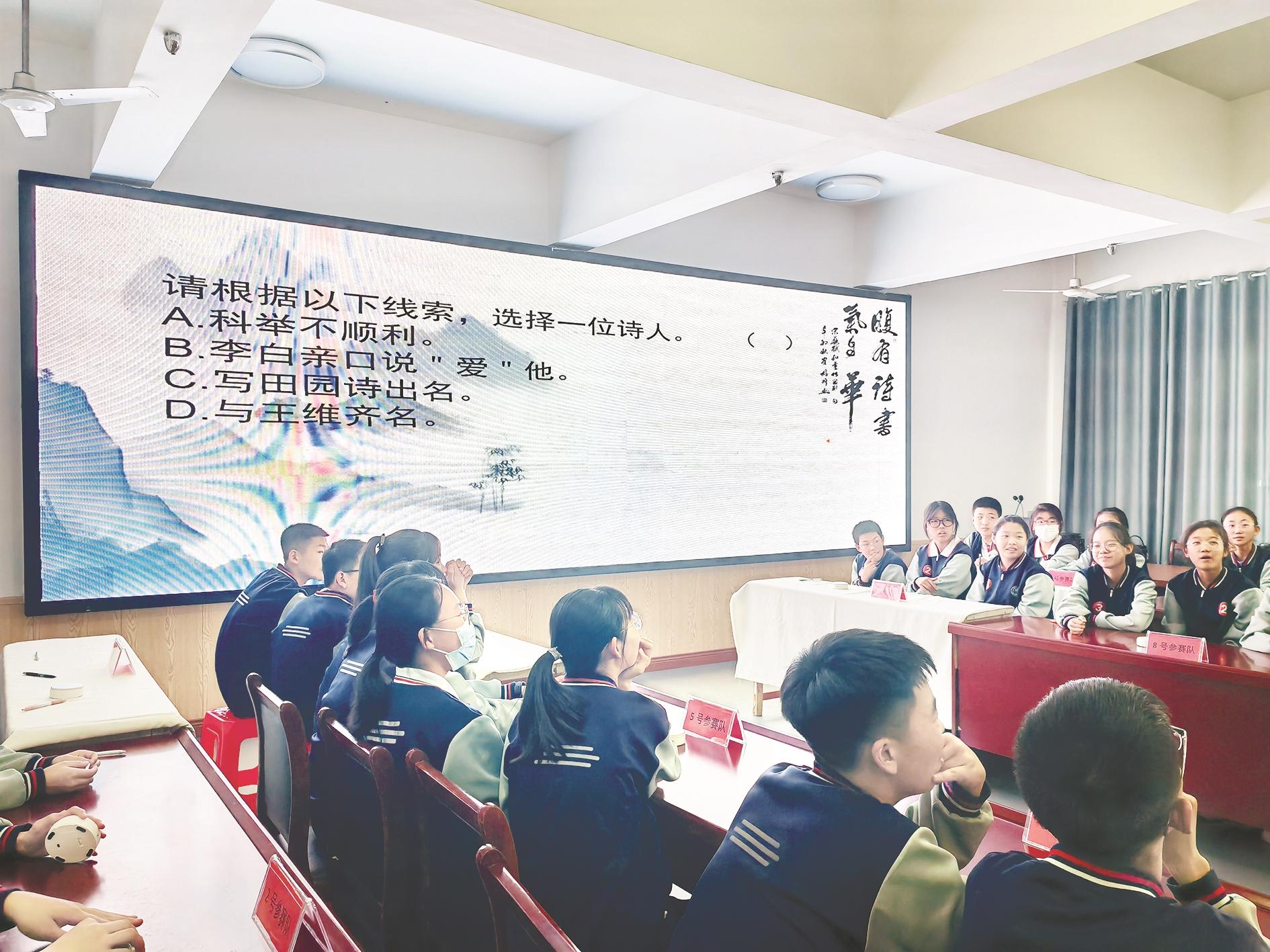 为传承优秀诗词文化,感受其博大精深的精神内涵,大力培养中学生对古诗词的兴趣,4月24日,市第十二中学举办“诗韵斗艳 华彩竞辉”第十届“阳光悦读·润泽心灵”中华好诗词大赛。活动不仅丰富了学生的诗词知识储备,还让学生深刻感受到了经典诗词的魅力。 (郑彩虹 摄)