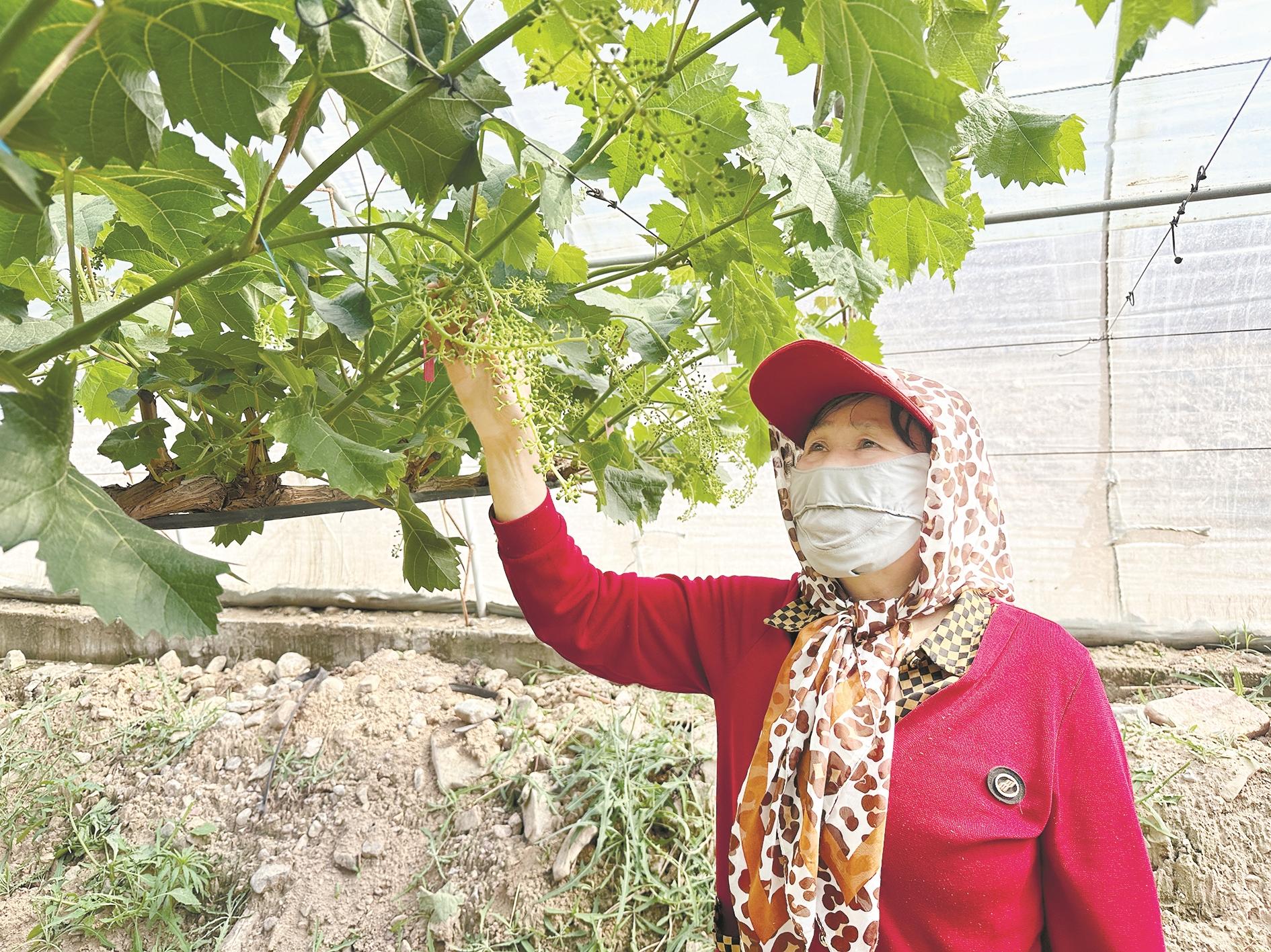 眼下正值葡萄生长期,大棚内葡萄长势旺盛。工作人员介绍,标记是为了区分每一串葡萄的沾药时间,疏果是为了让葡萄可以更好地吸收养分,成熟后果实饱满、香甜。(王蒙 摄)