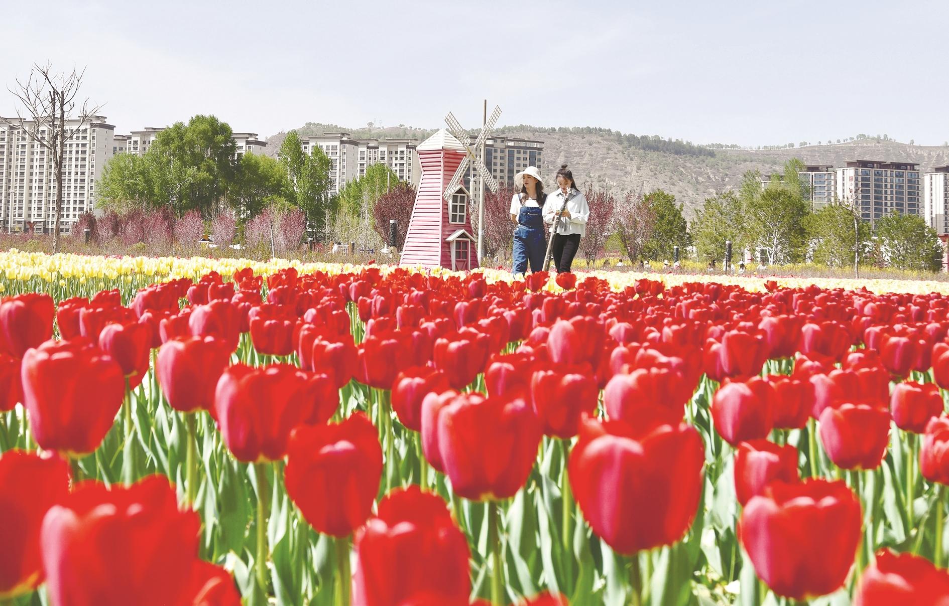 4月27日,游客在甘肃省康乐县胭脂湖公园里欣赏郁金香。暮春时节,人们来到户外赏花游玩,享受美好春光。