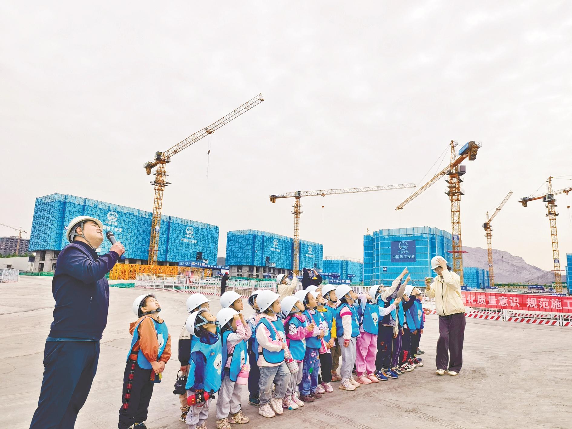 4月28日,中铁铁工城市建设有限公司海勃湾区2022年工业园区保障性安居工程EPC项目部联合海勃湾区第九幼儿园开展实地研学活动。活动中,项目管理人员通过生动形象、通俗易懂的话语向幼儿们讲解了施工工艺流程、机械运转方式以及建筑工程对于改善民生的重大意义。 (郭威 摄)