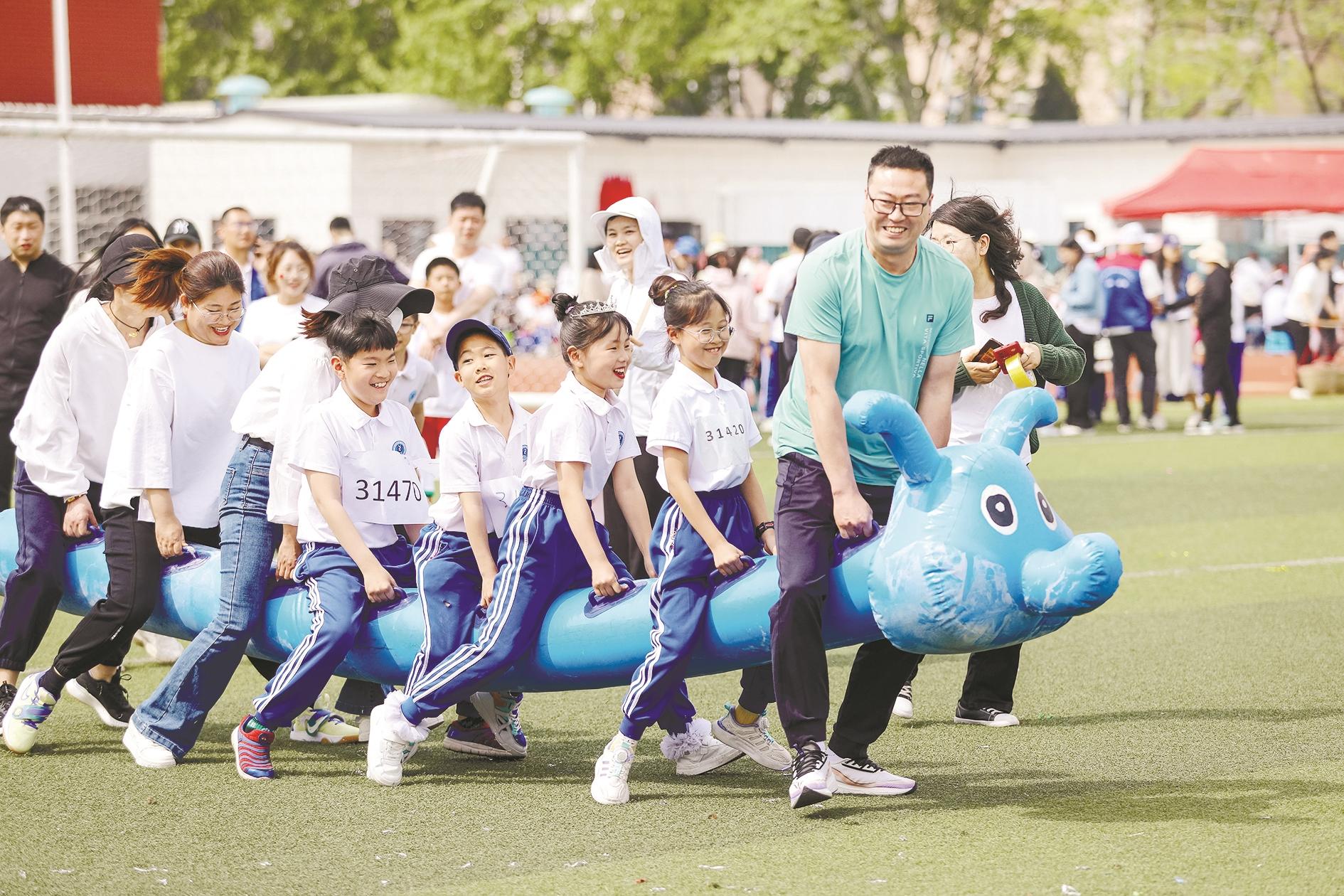 4月28日,在山东省青岛市城阳区第二实验小学,学生和家长一同进行“疯狂毛毛虫”趣味运动比赛。“五一”国际劳动节临近,各地开展丰富多彩的活动。 新华社发(张鹰 摄)