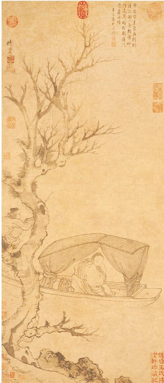 张渥(?——约1356年),元代画家。字叔厚,号贞期生、江海客,祖籍淮南,后为杭州人。博学多艺,累考科举不中,遂致力于诗画。善画人物,学李公麟白描,也有人说他学南宋梁楷。笔法细劲,形象生动。《雪夜访戴图》,立轴,纵91.1厘米,横39.3厘米。纸本设色。《雪夜访戴图》,是一幅山水、人物相结合的佳构。作品对雪溪(剡溪)具体环境的描写着力较少,而侧重于写王徽之坐于船中的神情,表现隐逸之士的高洁品德与情怀。只见,画幅下端为山石河岸,岩石横列,坡岸有一棵树拔地而起,枝干粗壮,曲直向上,树上长满疤结,树叶已凋落,呈现出一派严冬的气象。画幅近中间部位,画有扁舟,船舟上搭有宽敞船棚,孤舟一叶行进在溪流中。船窗内端坐一位高士:王徽之,双手拢袖,在船舱内读书,双目凝神,专心致志。船尾的船夫以袖裹篙正在使劲撑着船篙。该图人物造型准确,虽仅寥寥数笔,却将人物刻画得维妙维肖,神态自然,神形俱在。在构图上作者采用近景构图,着重突出正行驶的舟楫,画面有意侧重写出主人翁双手拢袖,一株脱尽树叶的寒木,船夫畏寒瑟缩等,以衬托出雪夜寒意的情景。此图曾经清人潘延龄、宫子行、何瑗玉和乾隆内府以及近人庞元济收藏。图上有清高宗弘历题诗:“雪夜觉来乘兴行,剡溪沿溯一舟轻。传神恰是斯时好,较胜门前著语情。”图上署款“叔厚”,下钤“叔厚”白文方印、“游心艺圃”朱文方印。