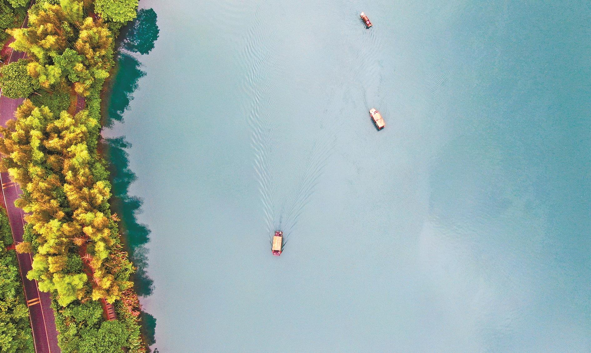 5月5日,游客乘坐游船在湖南省资兴市东江湖景区小东江景点游玩赏景。五一假期,各地秀丽的风光和多彩的活动吸引游人纷至沓来。 新华社发(李科 摄)