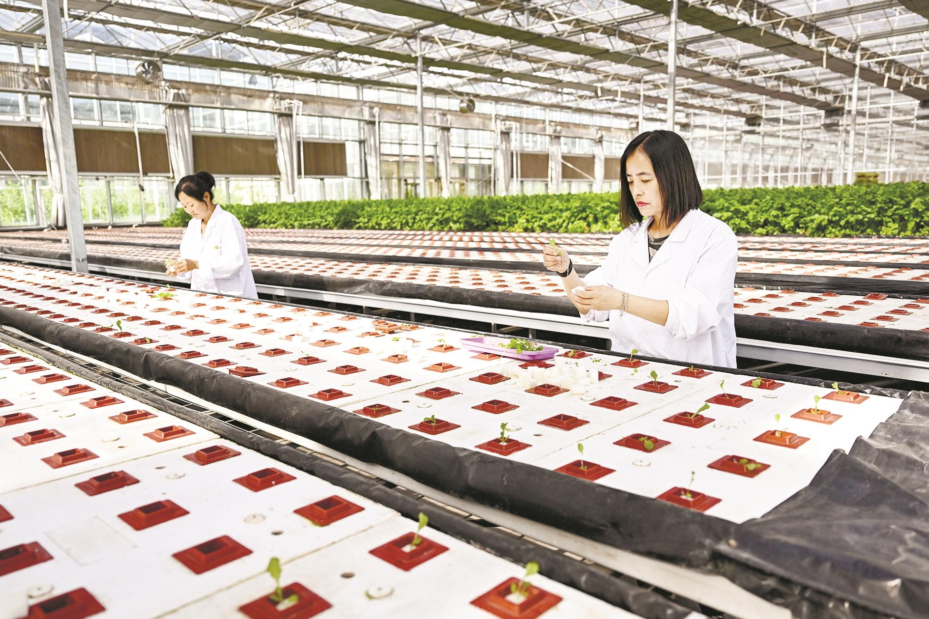 5月11日,在土默特右旗敕勒川现代农业产业园,工作人员在栽培蔬菜苗。近年来,内蒙古包头市土默特右旗积极发展现代农业,推广蔬菜无土栽培等农业技术,提高蔬菜产量,助推乡村振兴。