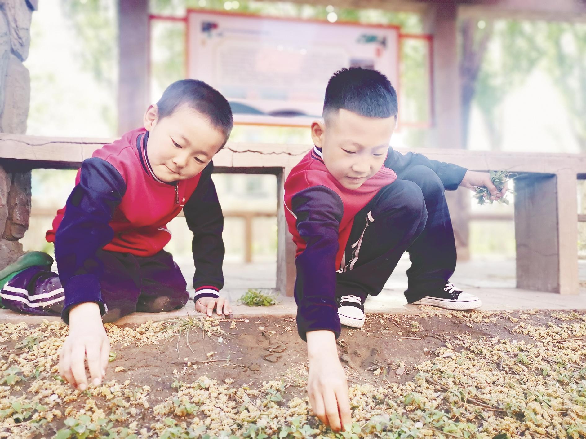 近日,乌达区巴音赛街小学学生来到劳动基地,在老师的指导下,有条不紊地进行翻地、施肥、播种等工作,在劳动中学习知识,收获成长。 (陈洋 摄)