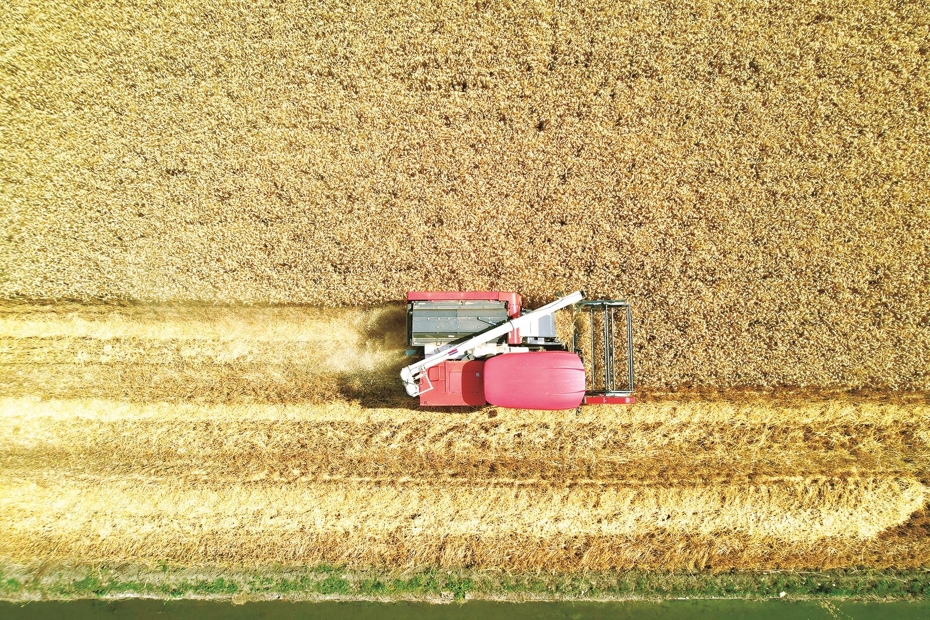 5月13日,在四川省广汉市国家现代农业产业园,收割机在收割小麦(无人机照片)。近日,四川省各地的小麦陆续进入收获期,当地农民紧抓农时,开展夏收作业,确保夏粮归仓。 新华社记者 杨进 摄