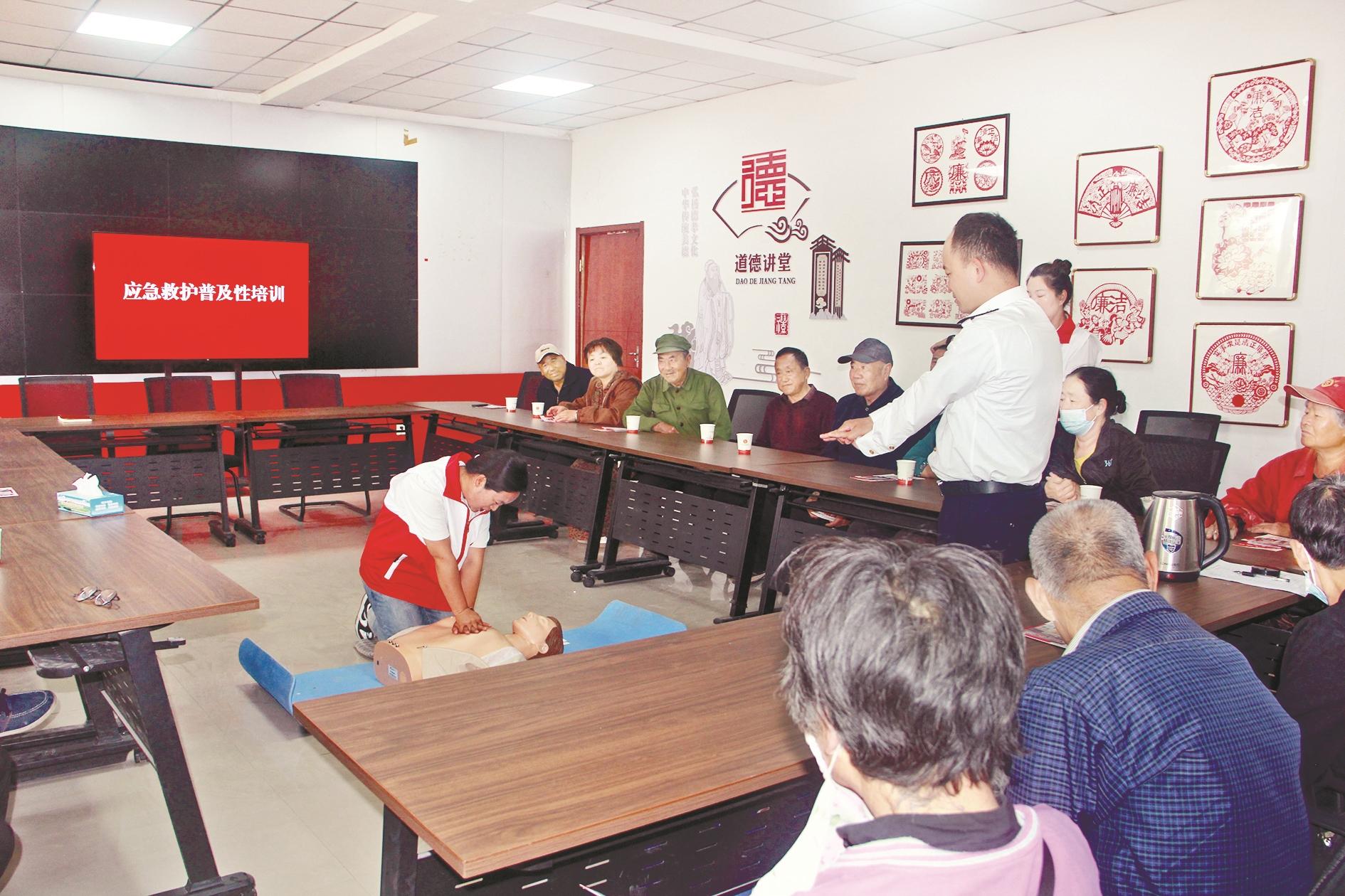 5月10日,海勃湾区红十字会在滨河街道中河源社区开展救护知识培训,现场为居民们讲解心肺复苏“黄金四分钟”的急救知识,并手把手指导居民们开展实际操作。 (段维娜 摄)