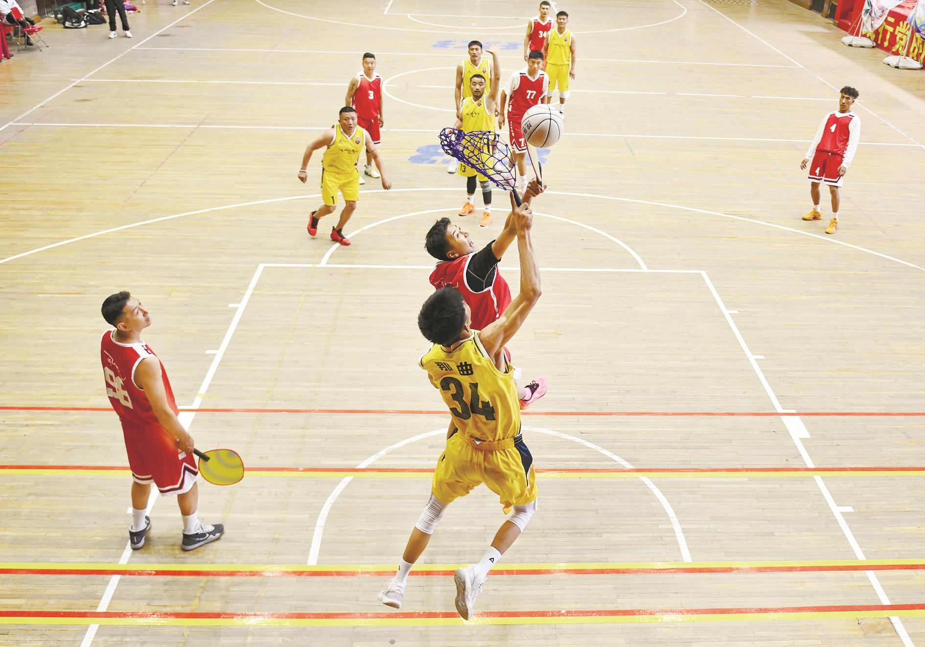 5月14日,那曲队洛桑伦珠(前)在比赛中。 当日,第一届全国全民健身大赛(西南区)西藏自治区珍珠球选拔赛在拉萨举行。珍珠球源自满族民间游戏“采珍珠”,是由模仿采珠人的劳动而逐渐演变而来。 新华社记者 晋美多吉 摄
