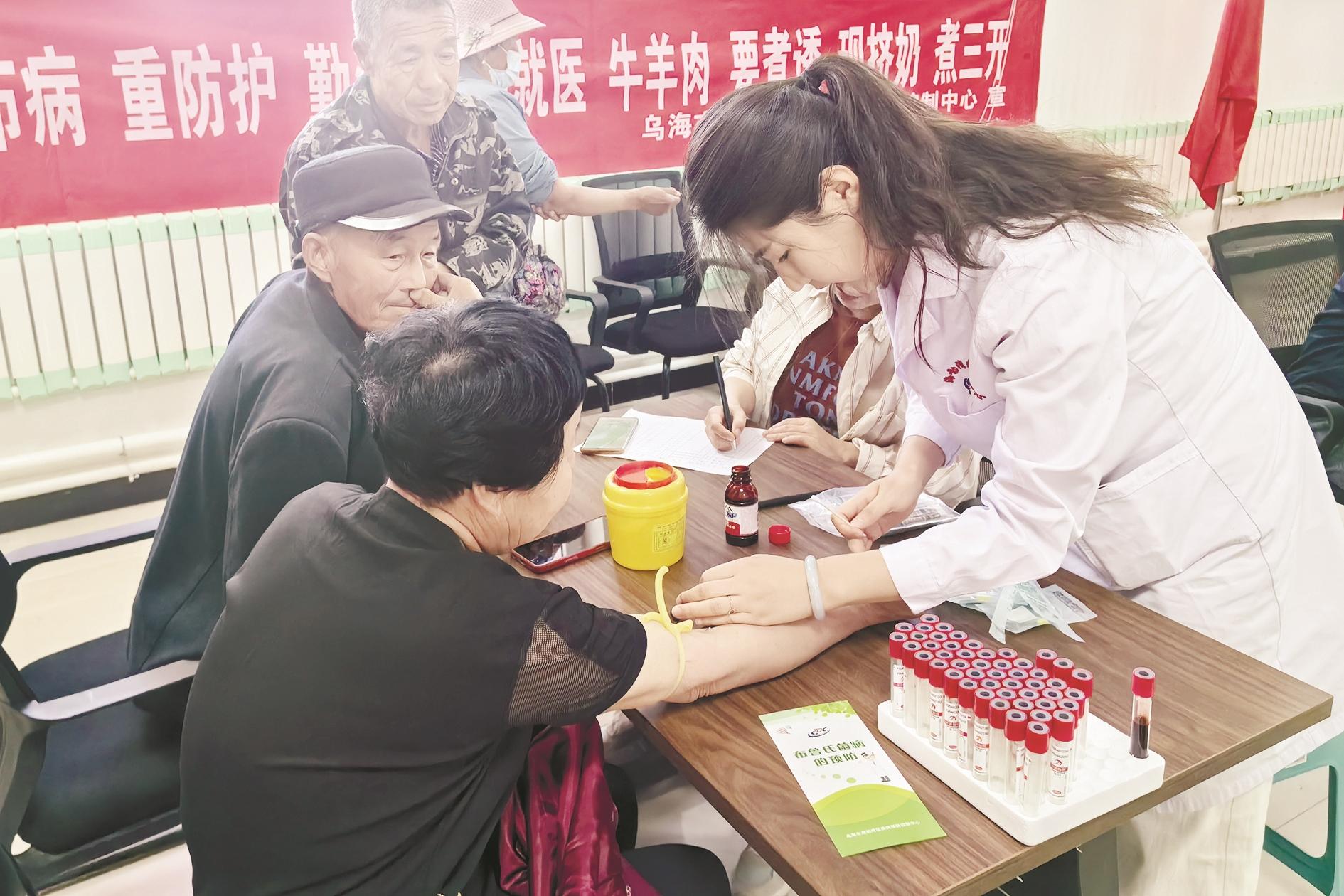 近日,海勃湾区疾病预防控制中心医务人员走进滨河街道中河源社区开展了布鲁氏菌病免费筛查志愿服务活动。医务人员为辖区养殖户抽血采样,并宣传了布鲁氏菌病的传播途径、临床症状、预防措施等内容。(黄建飞 摄)