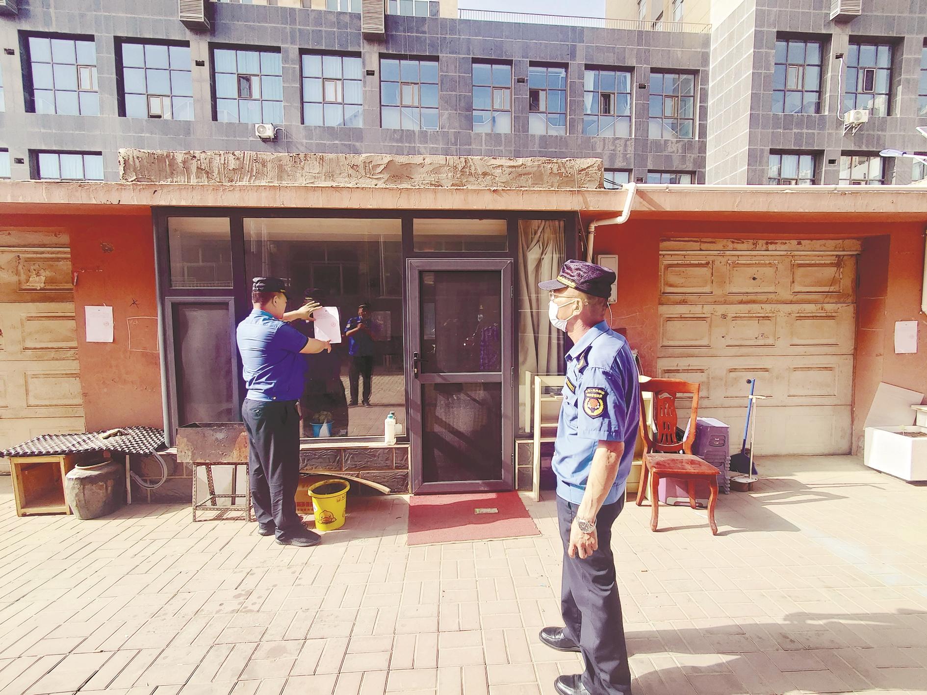 海勃湾区新华西街道海达社区加大小区私搭乱建、乱堆乱放清理整治力度,并让其成为常态化工作。图为日前执法人员给业主张贴限期整改通知单。 (毕晓敏 摄)