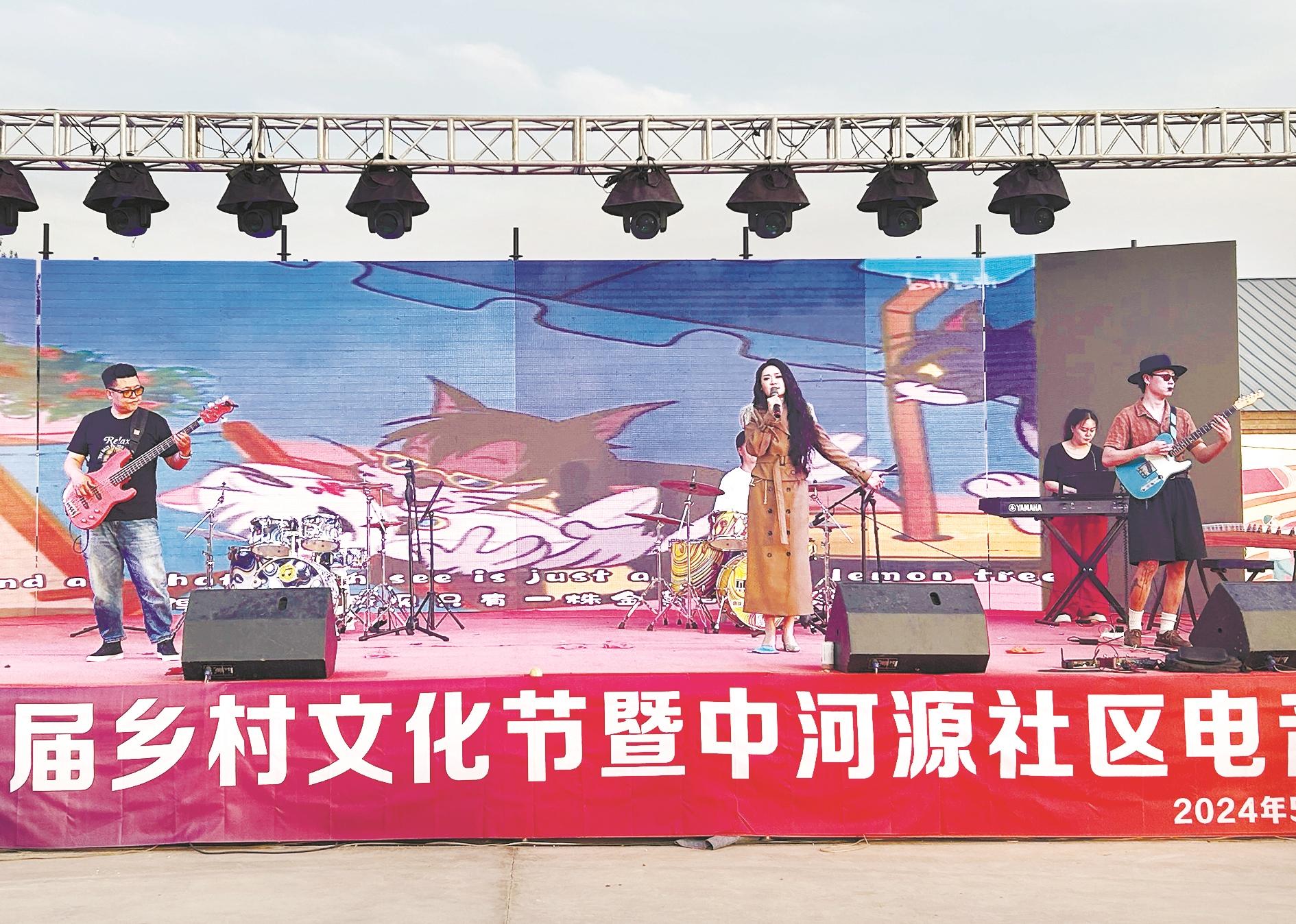 5月26日,海勃湾区第二届乡村文化节暨中河源社区电音啤酒节开幕式在中河源社区广场举办。舞蹈、器乐演奏、歌曲等节目接连上演,为现场观众送去了欢乐。(张靖爽 摄)