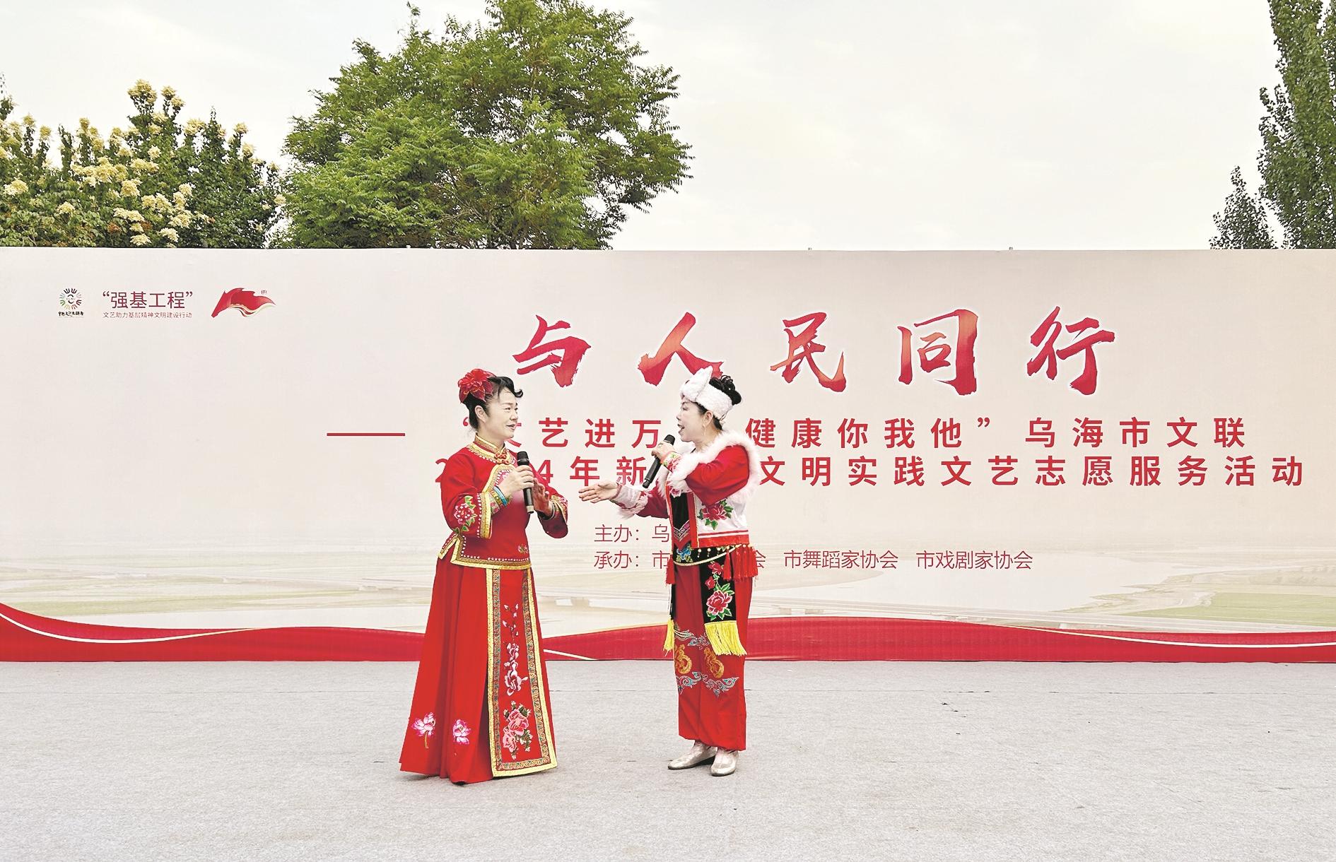 5月23日,由市文联主办,市曲艺家协会、市舞蹈家协会、市戏剧家协会承办的学习宣传贯彻党的强基工程|与人民同行——“文艺进万家 健康你我他”乌海市文联2024年新时代文明实践文艺志愿服务在市人民公园举办。演出现场,歌曲、朗诵、戏剧等节目轮番上演,弘扬了中华优秀传统文化。 (张靖爽 摄)