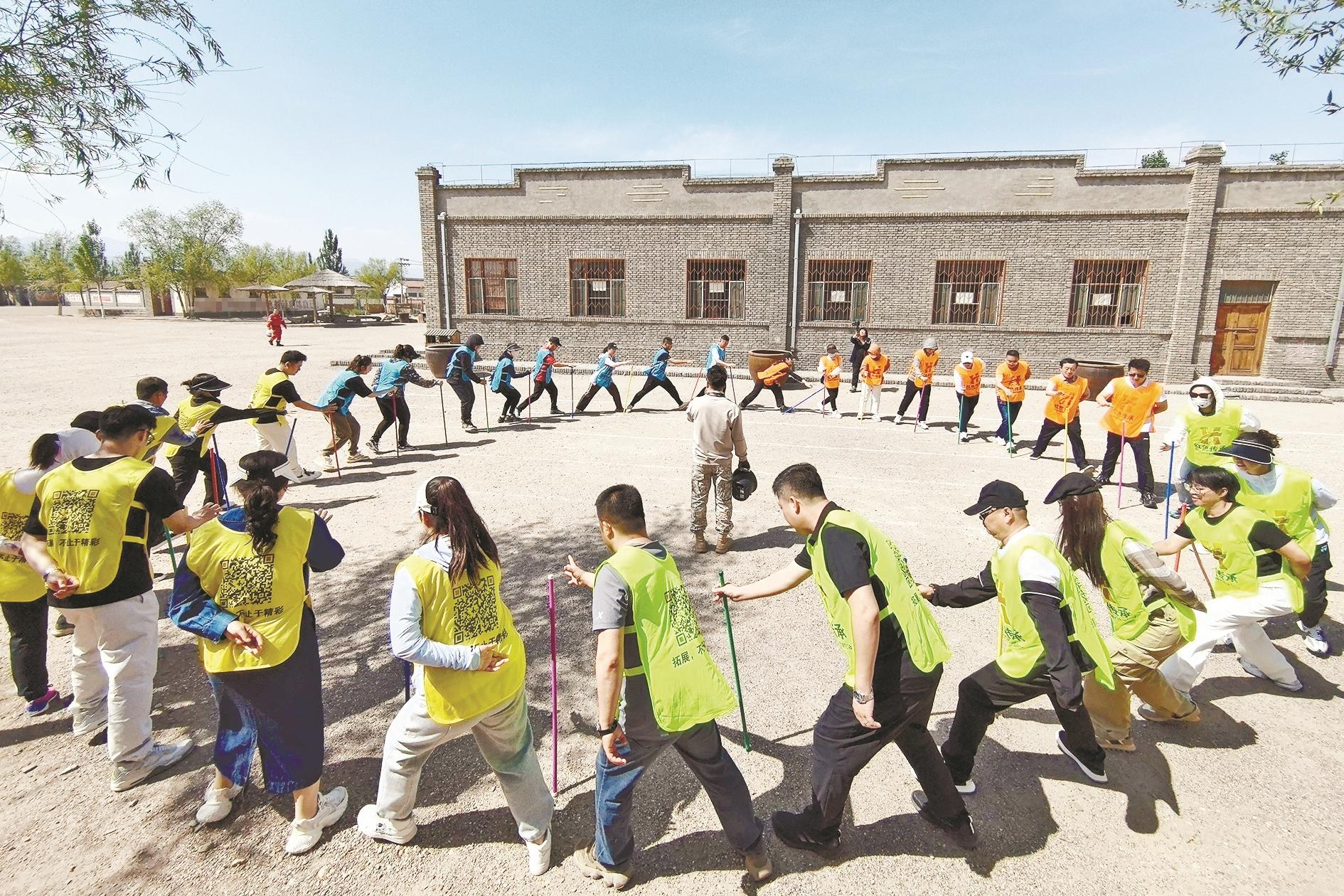 近日,市工商业联合会举办“薪火相传担重任 凝心聚力谱新篇”乌海市年轻一代民营企业家培训班,开展参观展馆、现场教学、户外拓展、应急救护培训等活动。图为参加培训的民营企业家开展户外拓展活动。 (黄建飞 摄)
