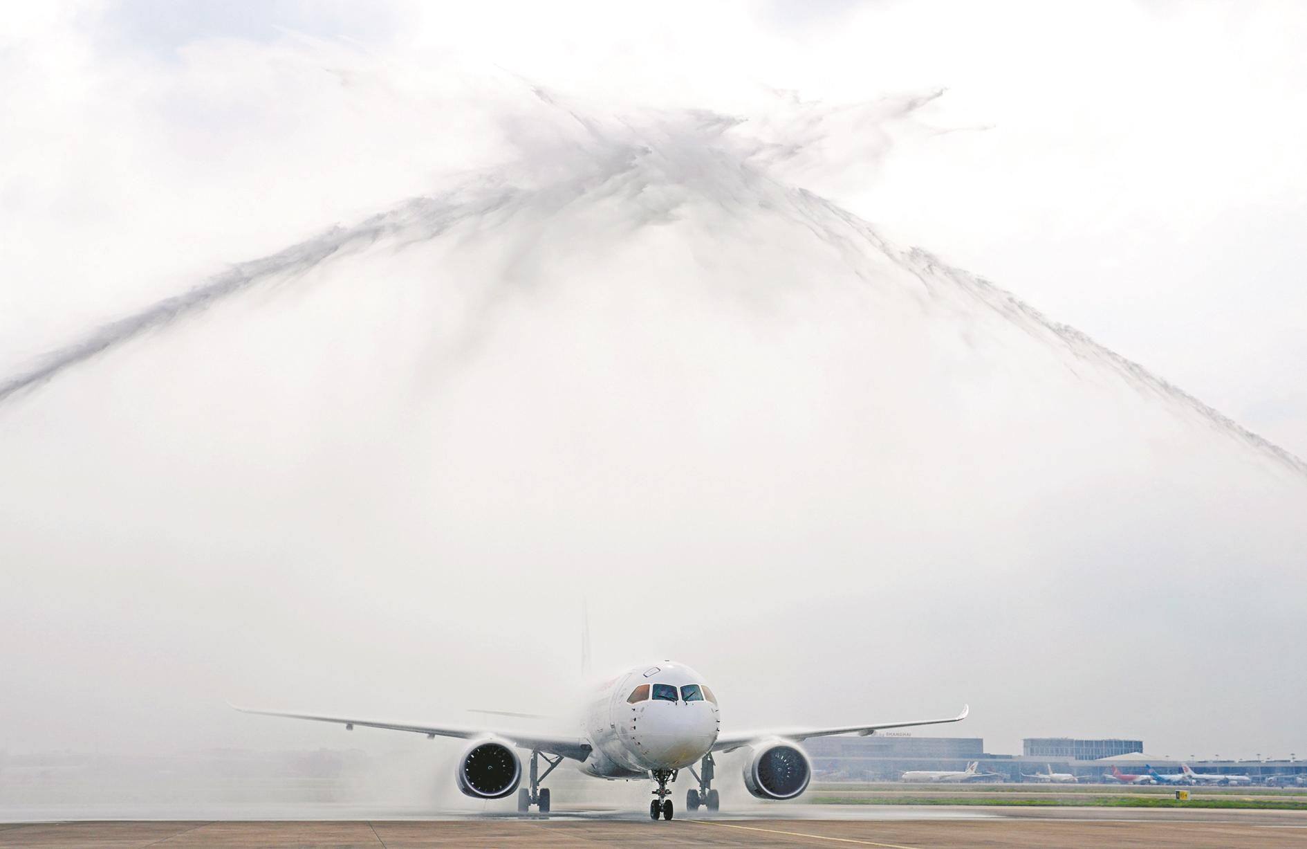 6月1日,上海虹桥机场以“水门”仪式迎接由C919执飞的MU7192航班。当日,由中国东方航空公司C919国产大飞机执飞的MU7192航班,自香港特区飞抵上海,顺利降落在虹桥机场,机上承运了从香港前往上海实习的百余名香港青年学子。据介绍,抵达上海的百余名香港青年实习生将在上海开展实习、参访和交流活动。这是C919首次执飞跨境商业包机。航班于当天上午自上海虹桥机场出发,11时许抵港。随后,启航仪式在香港机场举行。