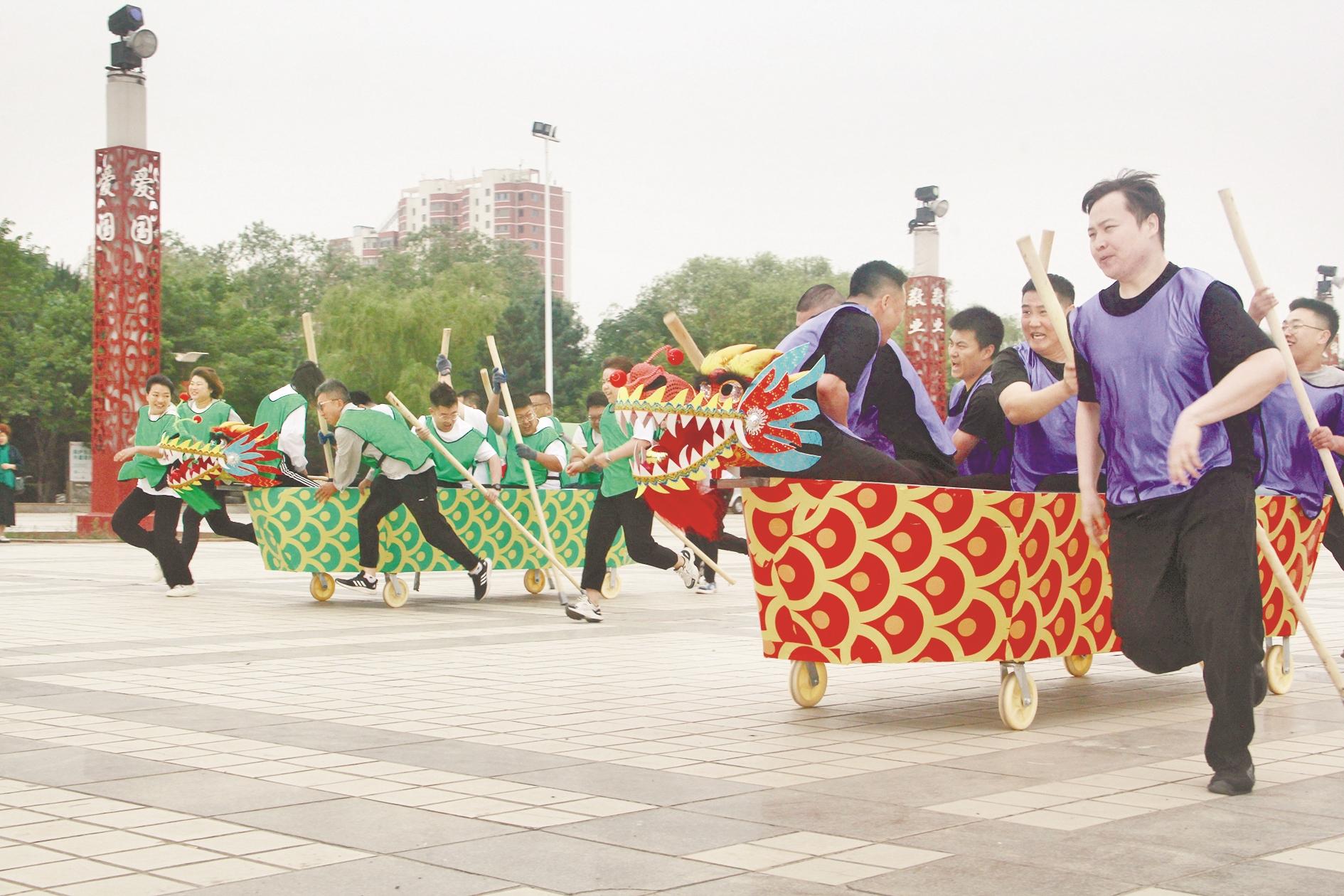 在我国传统节日端午节到来之际,我市举办多种活动,营造出浓浓的节日氛围。图为6月6日在市人民广场举行的旱地龙舟比赛现场。 (段维娜 摄)