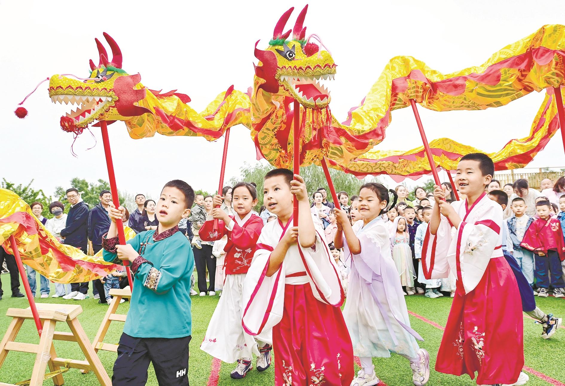 6月5日,内蒙古鄂尔多斯市康巴什区第十二幼儿园的孩子们在体验舞龙。 端午临近,各地举行赛龙舟、包粽子、摘艾叶、做香囊等丰富多彩的活动,迎接传统佳节。