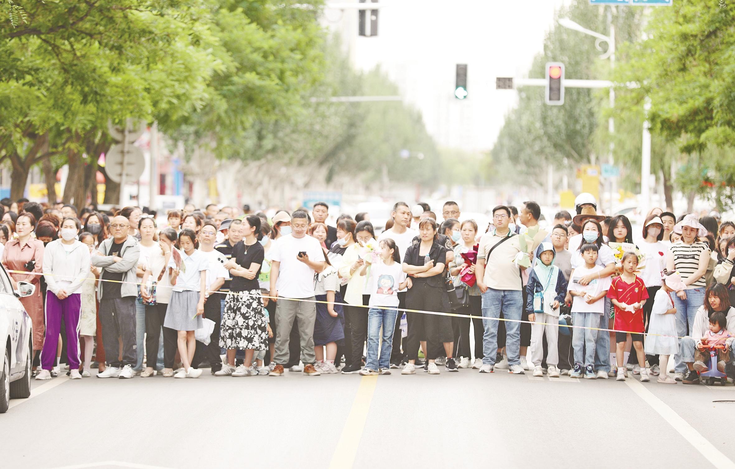6月8日下午4时30分,记者在乌海市第二中学考点外看到,警察、考务人员在现场维持秩序,开辟出一条考生通道。不少考生家长、亲朋好友翘首等待,他们手捧鲜花,准备在孩子考试结束后的第一时间送上祝贺。