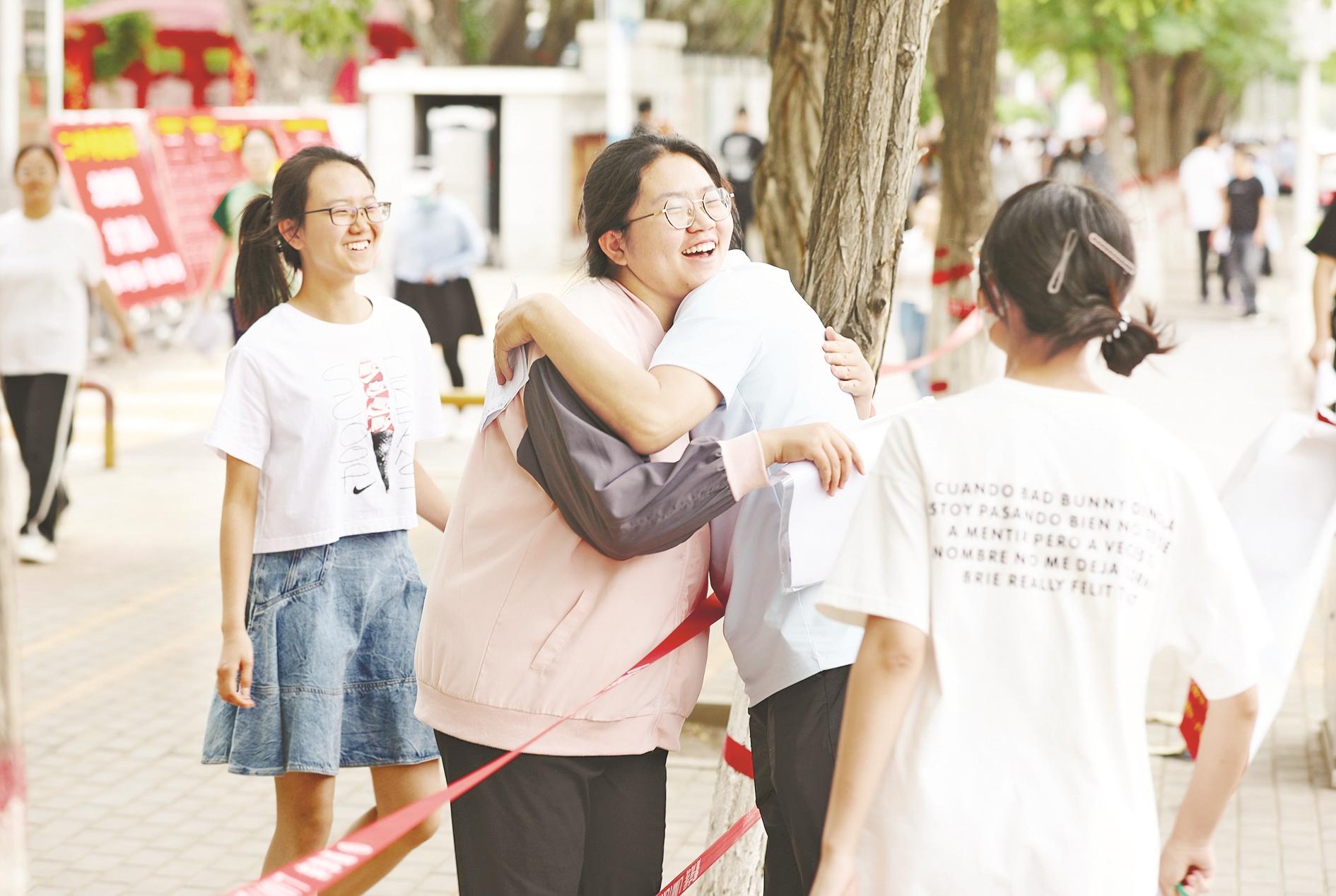 考场外学生与老师拥抱庆祝。(高瑞鹏 摄)