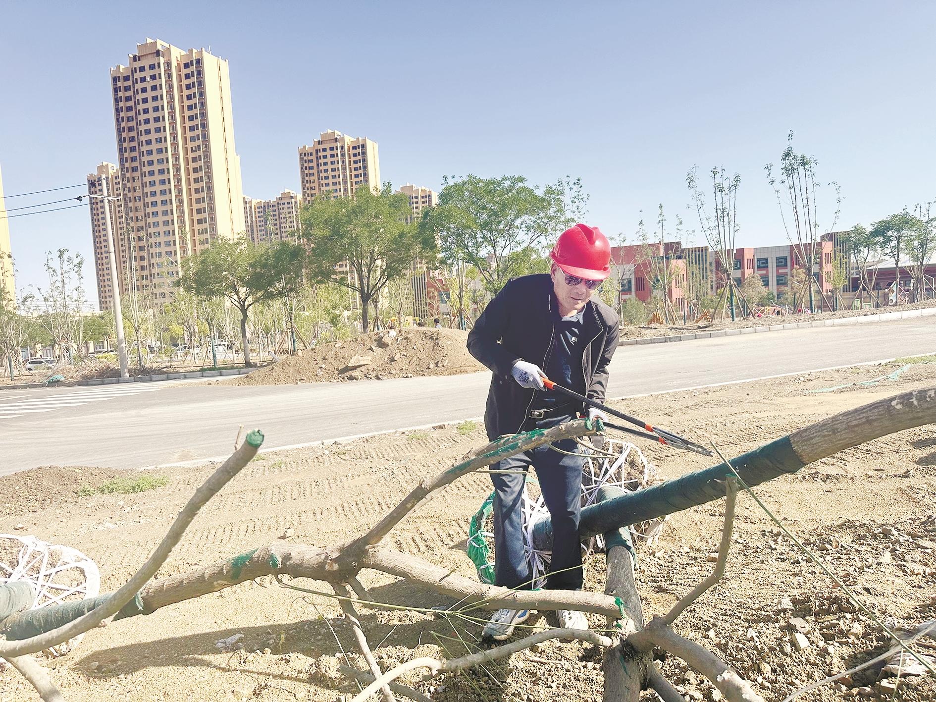 海勃湾区第十五幼儿园附近的道路两侧,这边,清理石块、平整土地、挖树坑;那边,修剪多余枝丫、树木栽种、回填等绿化工作正在有条不紊地进行着。