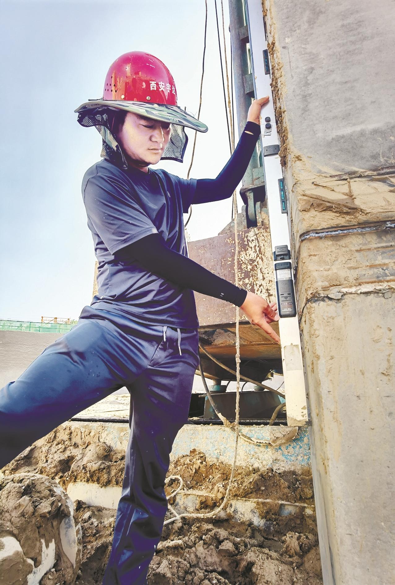 工作中的谢凯瑞一脸严肃,认真记录着每一次测量的数据,积极协调着施工中遇到的各种问题。他说:“万丈高楼平地起,一桩一瓦皆根基。我们打桩行业至关重要,在每一个人的心中都有一根名为‘安全’的准绳时刻提醒着自己。工作中,常常运用钻孔机、振动锤、GPS、水平靠尺等相关仪器和机械,严格按照施工图纸做好桩基定位、垂直度、承载力等设计要求。”