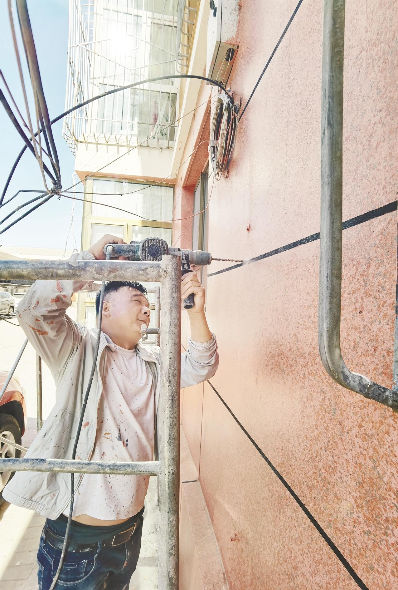 1991年出生的王勃在建筑外墙施工领域可是个多面手,能在墙上排列保温板、和砂浆、可挂网、刮腻子、刷涂料,也能在收尾工程中打胶、固定落水管。从新建住宅到老旧小区改造,外墙施工现场总有他的身影。一套落满漆点、灰尘的工作服,一顶安全帽,手套、电钻、螺丝刀等工具,这些便是他工作的全部家当。