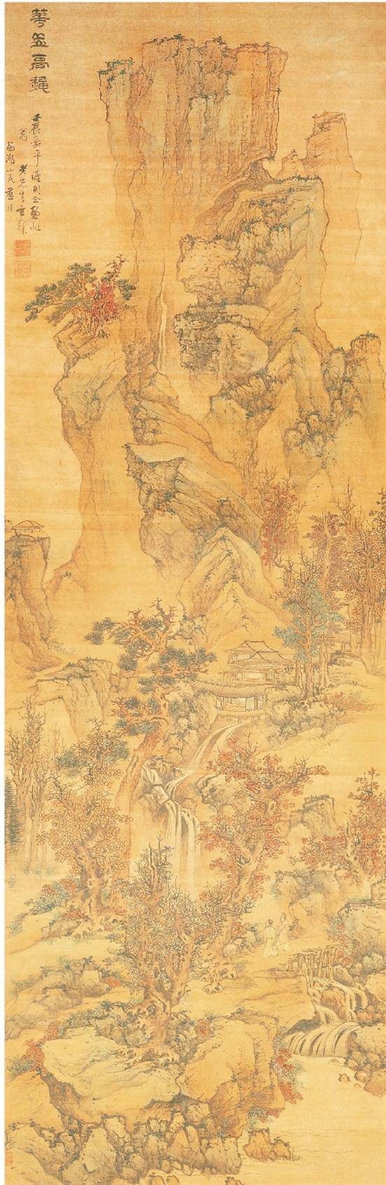 明末清初画家蓝瑛的《华岳高秋图》藏于上海市博物馆,绢本,设色,纵310.9厘米,横102.2厘米。此图采取高远法的构图方式,描绘西岳华山的深秋景色,气势雄伟,生动表现了华山高峻浑厚的万千气象。画面远景重崖叠嶂,奇峰突兀,峭壁屏立,直插云天,体现了华山之险峻。中景群山环绕,山径迂回,青松红枫,层林尽染,秋意浓郁。山坡上的一些树木经霜后,叶片或枯黄,或飘落,唯有枫叶流丹,火红一片,松树奇古苍劲,在萧瑟的秋风中愈显生机勃勃。山隈深处一处建筑格外醒目,重楼飞阁,雕梁画栋,显然这是一座庙宇。山崖间的瀑布如白练腾空,飞流直下。近景松柏苍翠,高大挺拔,丹枫迎秋,红叶灿灿。瀑布落下形成淙淙溪流,曲折蜿蜒,其上板桥卧波,两位高士立于桥上,驻足仰观飞泉溅落、秋景山色,倾听林啸阵阵、泉水叮咚,品秋赏景,交流观感,有远离尘嚣、飘飘欲仙之感。